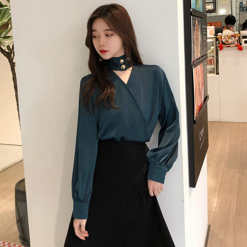 溫柔風氣質長袖襯衫女秋裝新款寬松上衣港味復古掛脖V領鏤空襯衣