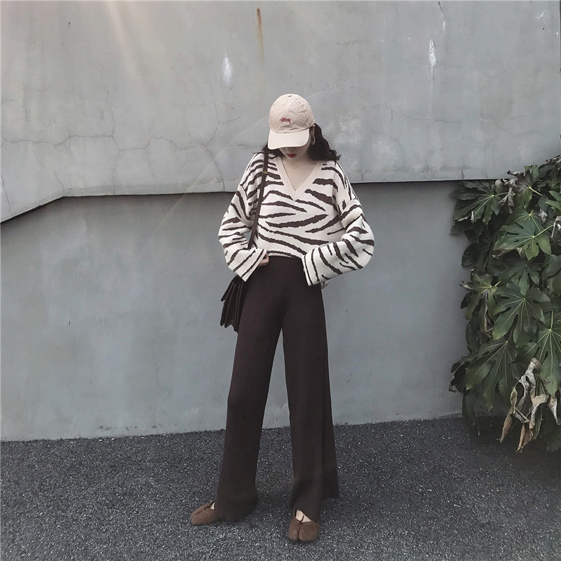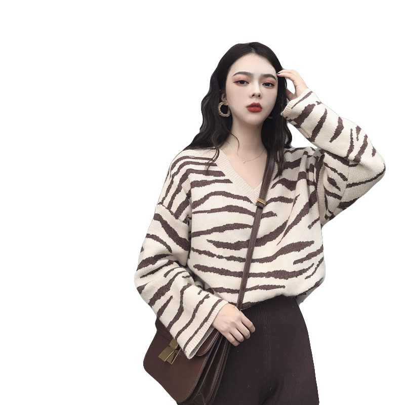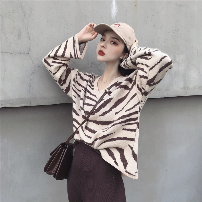 / chic慵懶風網紅毛衣女2018新款寬松百搭虎紋氣質套頭V領針織衫潮