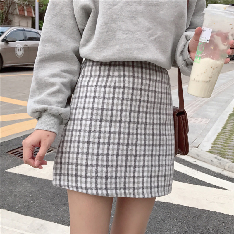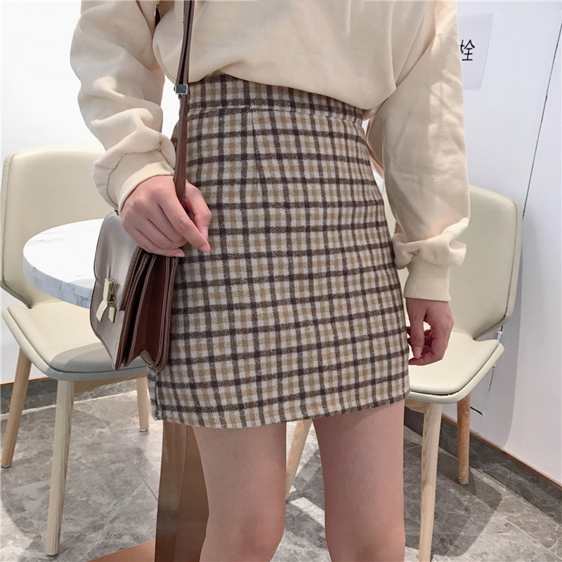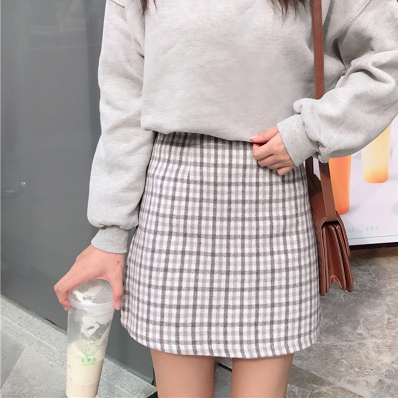 高腰半身裙女秋裝2018新款氣質毛呢短裙韓版復古格子包臀A字裙潮