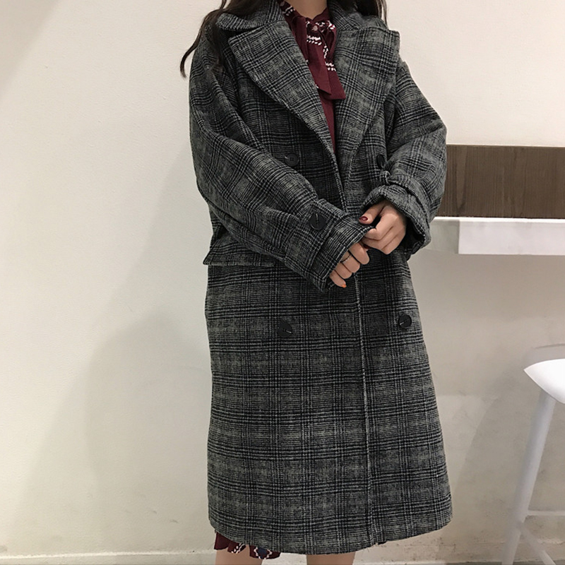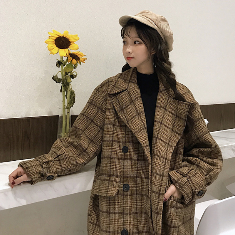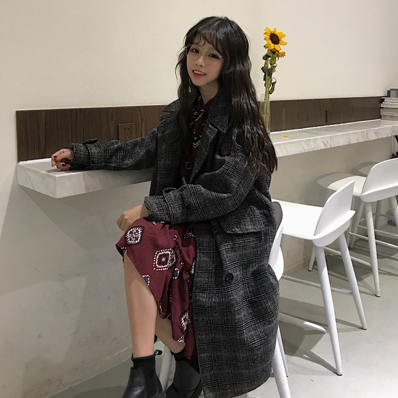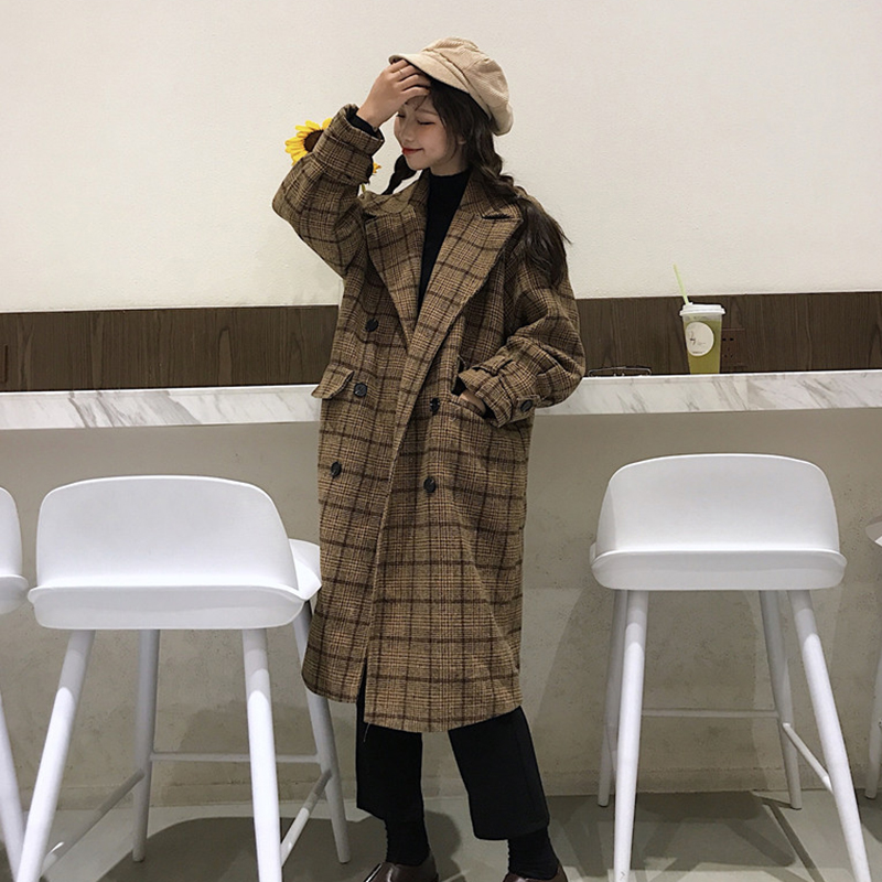 / 2018流行呢子大衣女秋冬裝新款復古風格子中長款寬松翻領毛呢外套