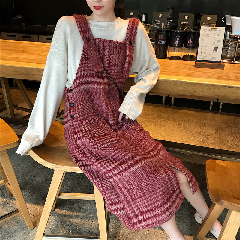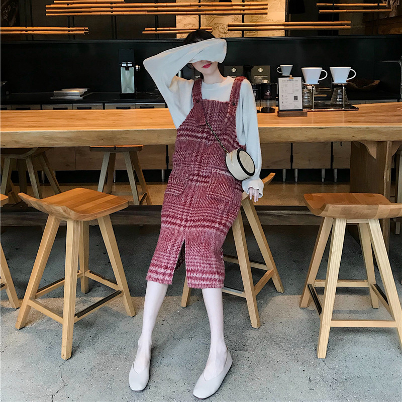 韓版時尚套裝慵懶寬松套頭開叉針織衫+氣質中長款格紋毛呢背帶裙