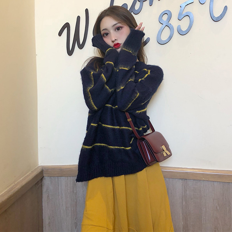 御姐套裝女秋冬新款慵懶寬松條紋毛衣外套高腰A字半身裙蛋糕裙子