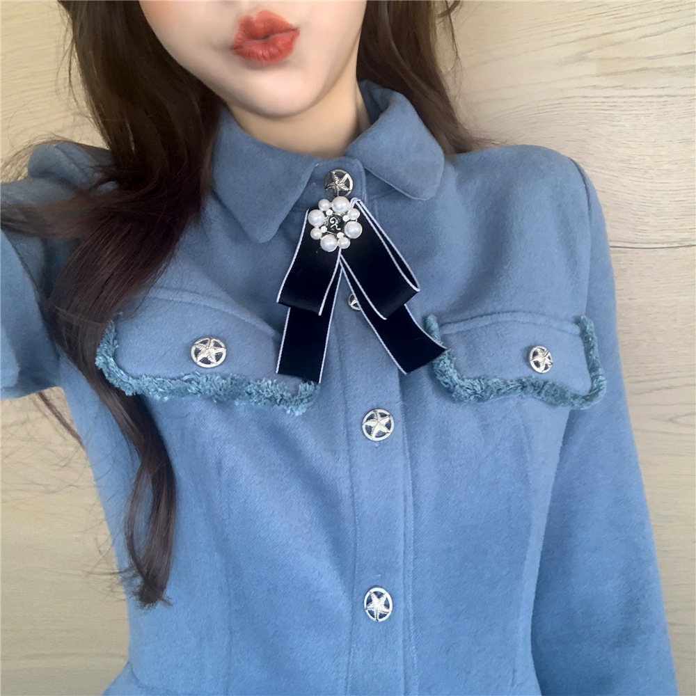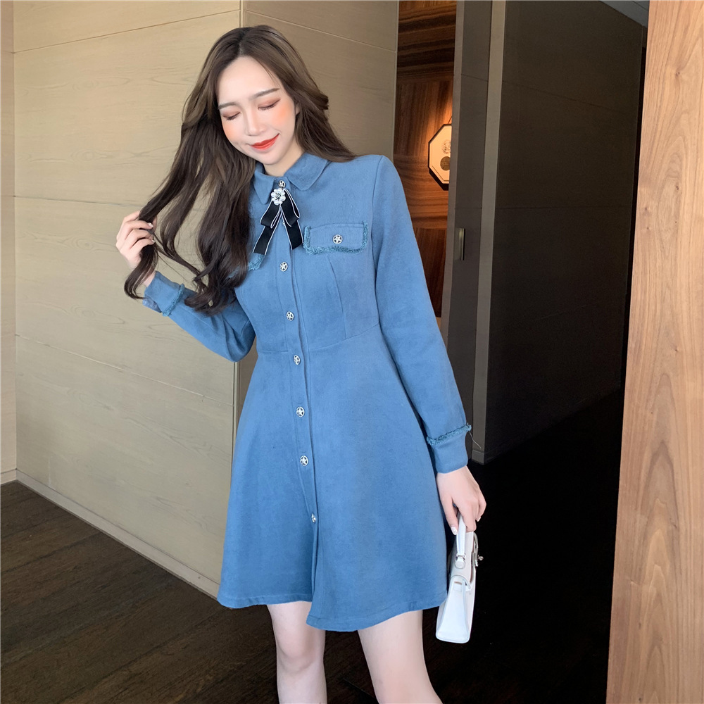 韓版秋裝女2018新款裙子氣質溫柔收腰A字襯衣領毛呢長袖連衣裙女