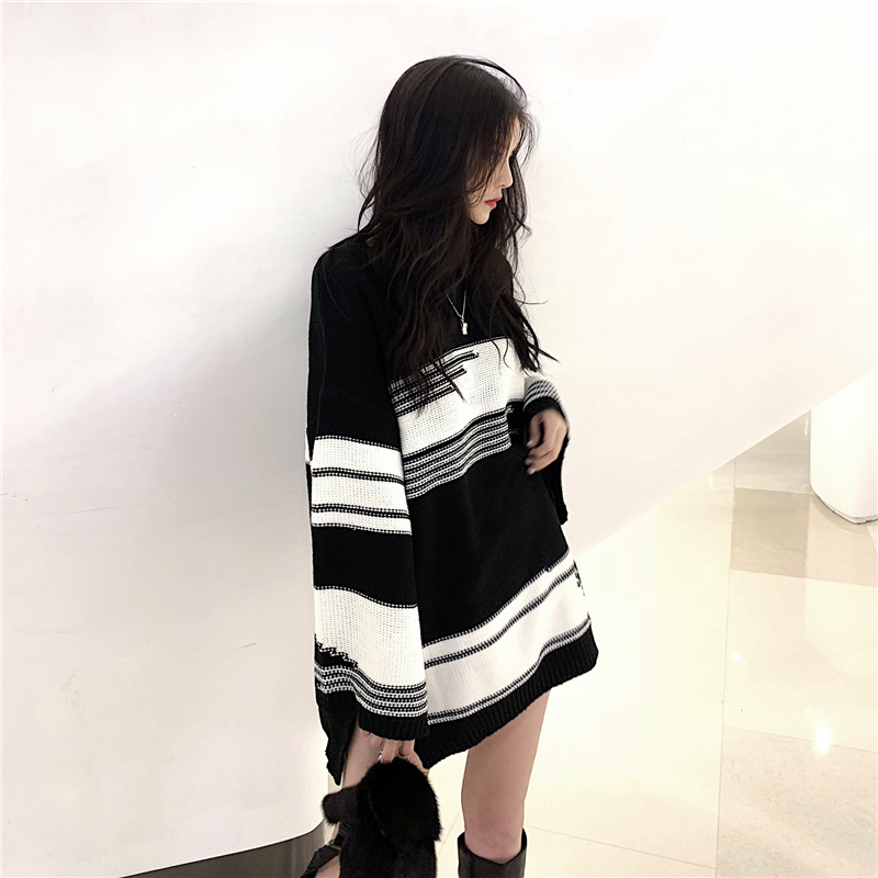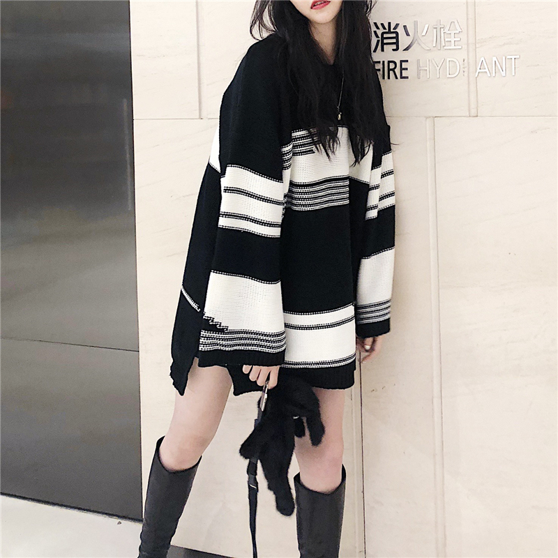 / 韓版網紅2018新款秋冬寬松慵懶風套頭毛衣女中長款黑白撞色上衣潮