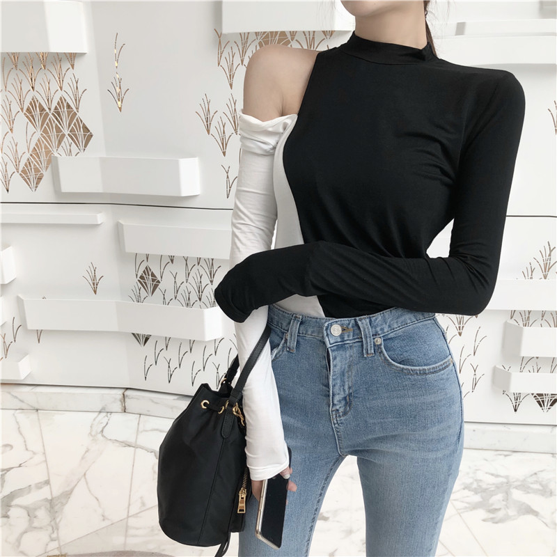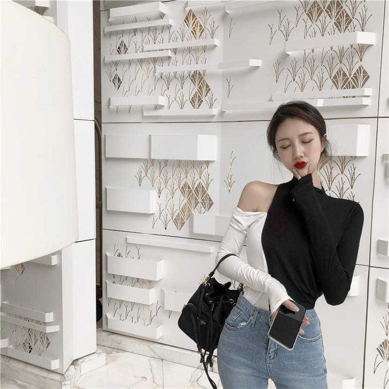 韓版時尚秋裝女2018新款黑白拼接打底T恤露肩設計款修身顯瘦上衣
