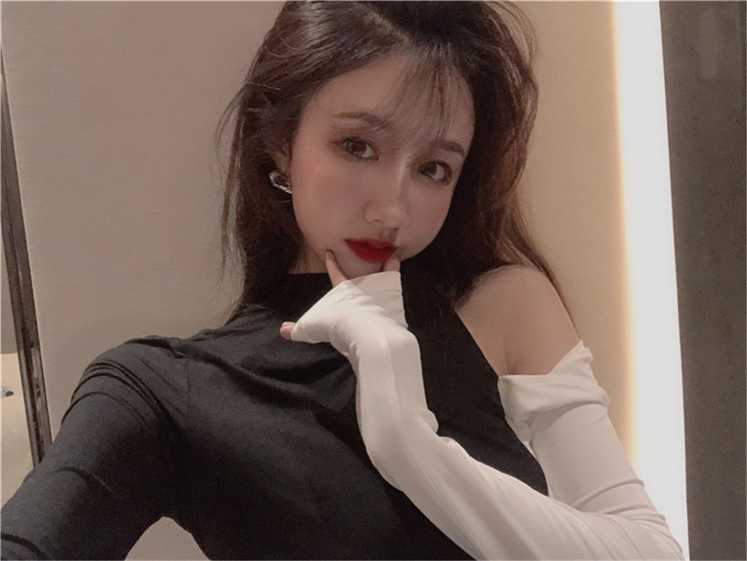 / 韓版時尚秋裝女2018新款黑白拼接打底T恤露肩設計款修身顯瘦上衣