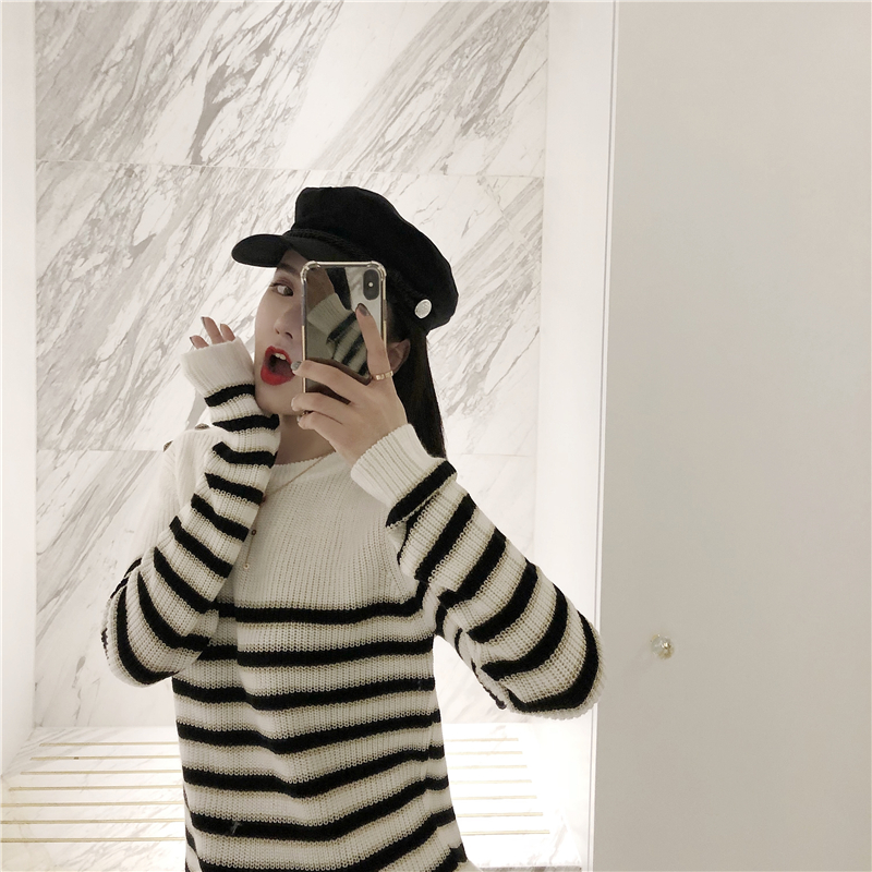 / 慵懶風套頭毛衣女2018新款秋冬金屬扣中長款條紋毛衣女針織衫上衣