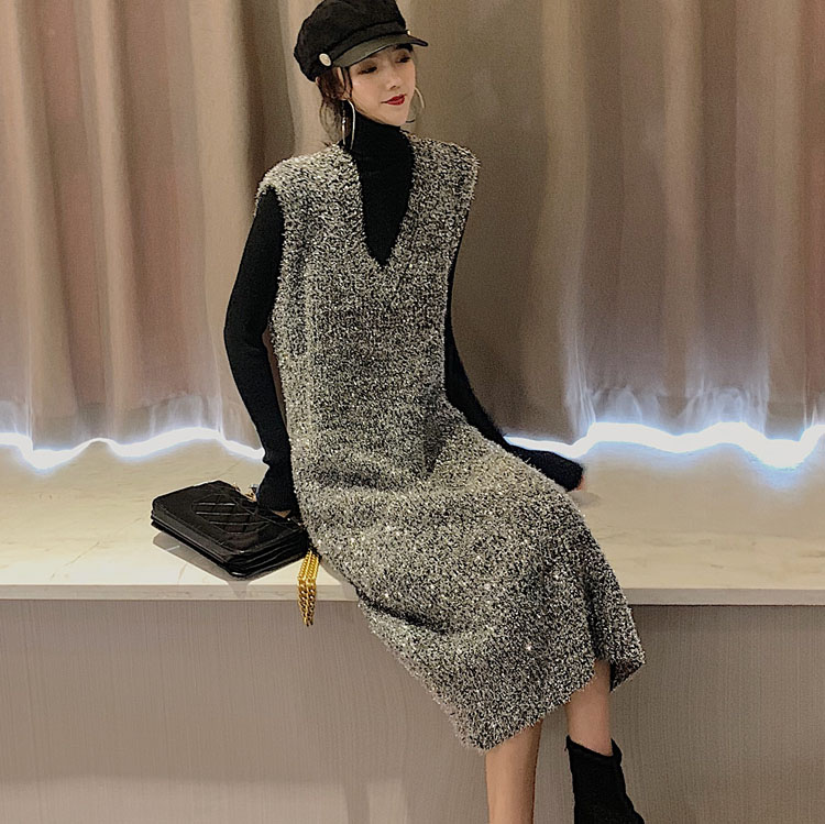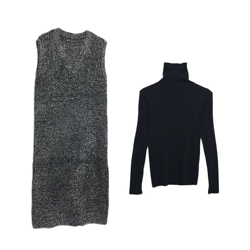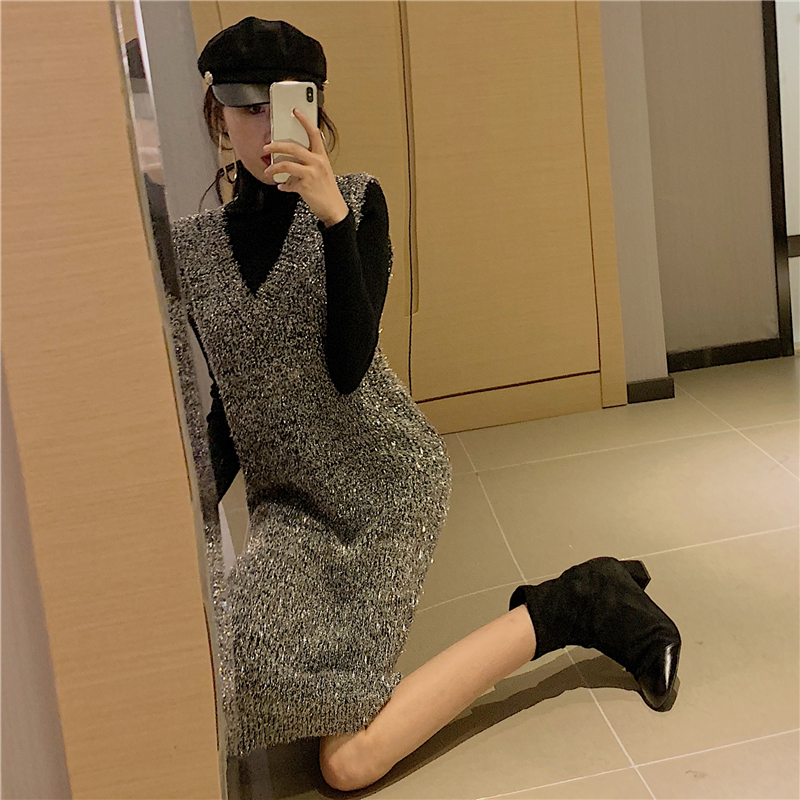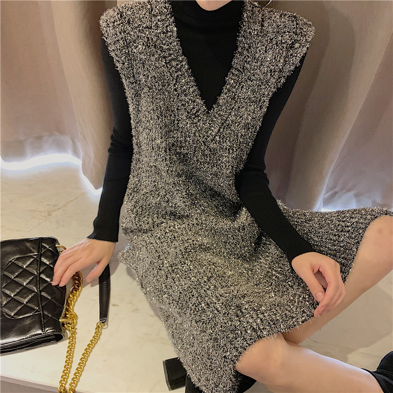 / 女神套裝新款bling閃閃亮絲無袖V領套頭背心裙+純色修身打底衫潮