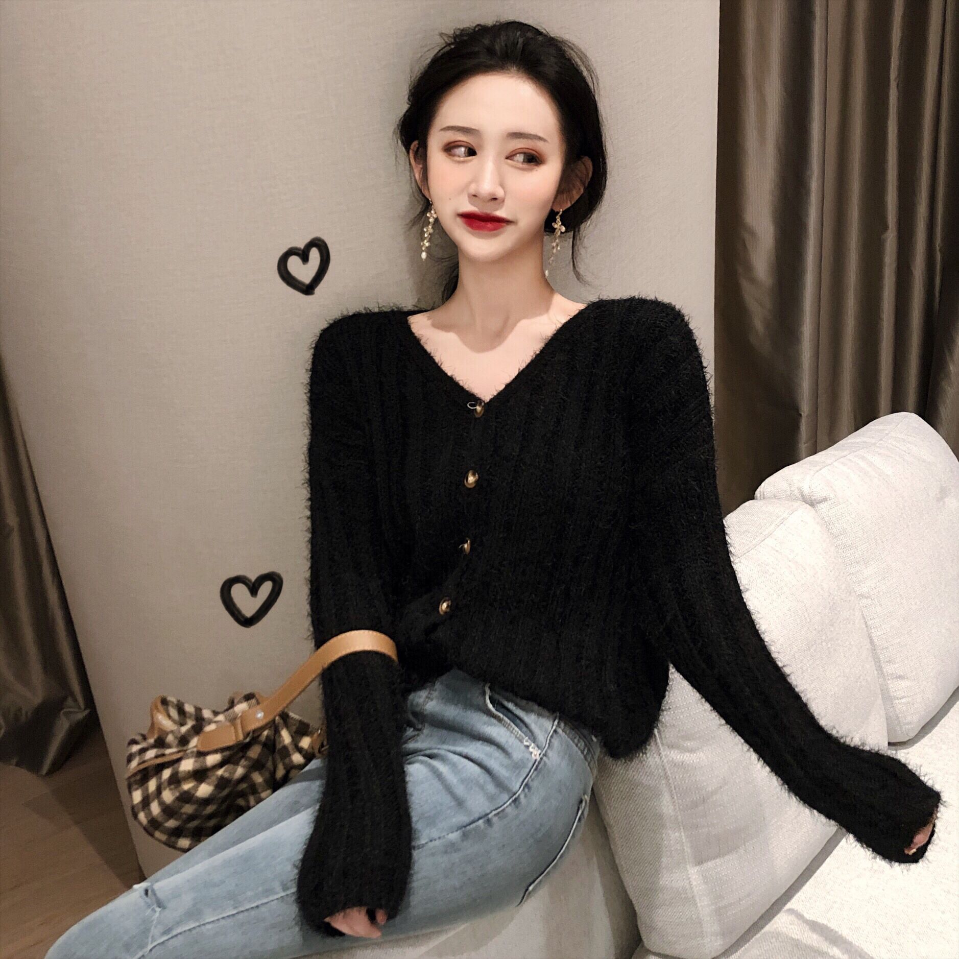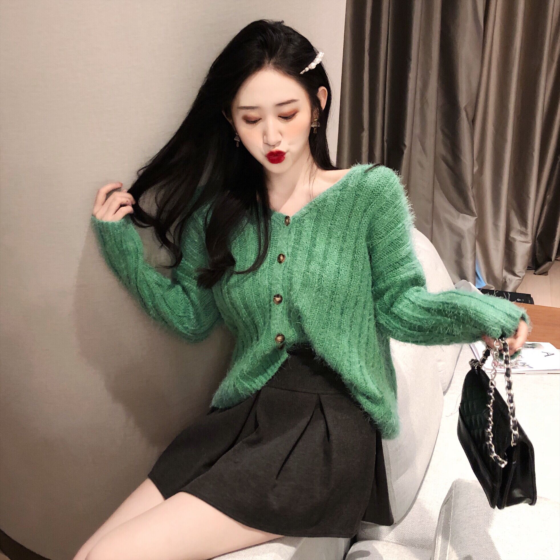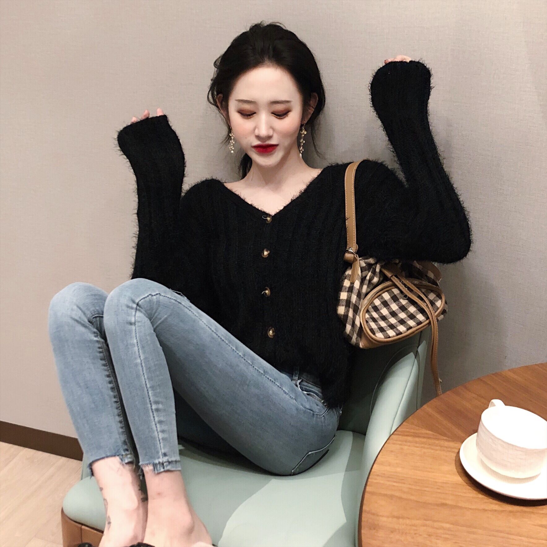 / 韓版慵懶溫柔毛毛坑條V領一排扣純色百搭毛衣女針織開衫短外套潮