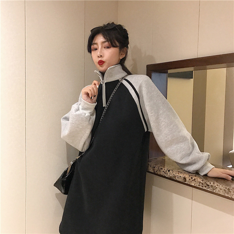 早秋衛衣2018新款女長袖韓版chic寬松顯瘦中長款拼色連衣裙衛衣潮