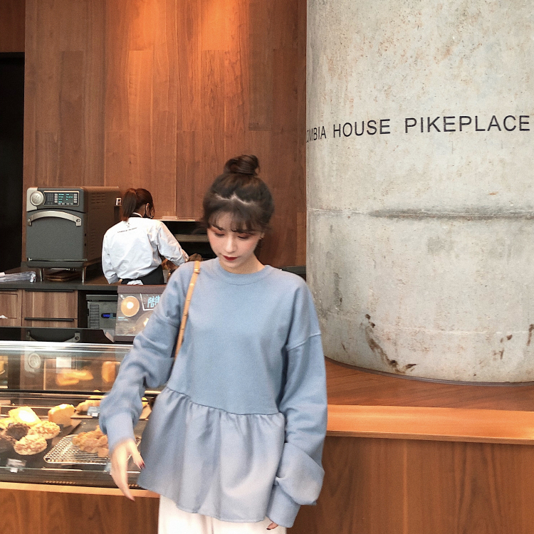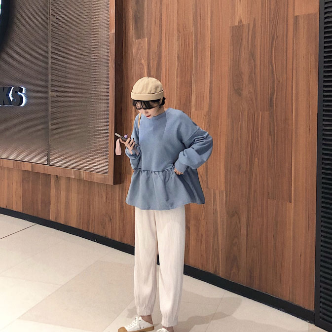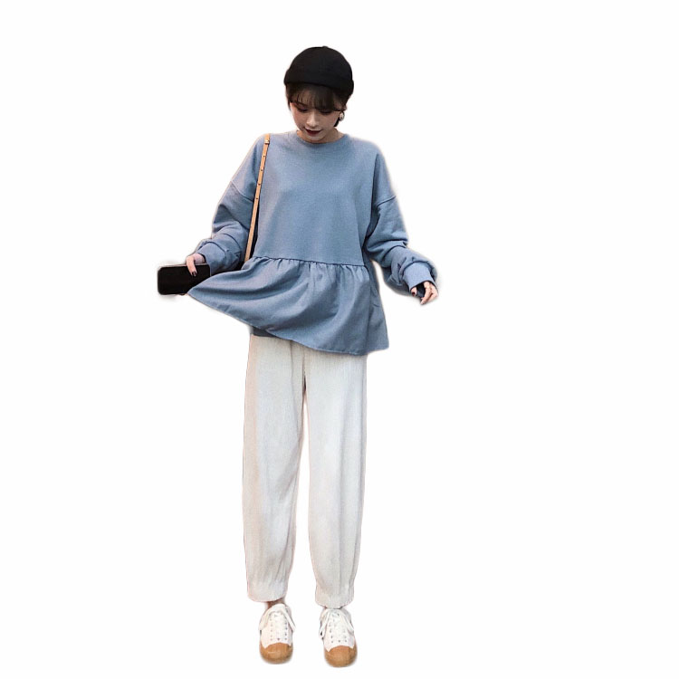 裙擺荷葉邊拼接套頭衛衣女秋冬新款+百褶麂皮絨寬松燈籠褲哈倫褲