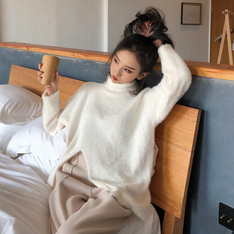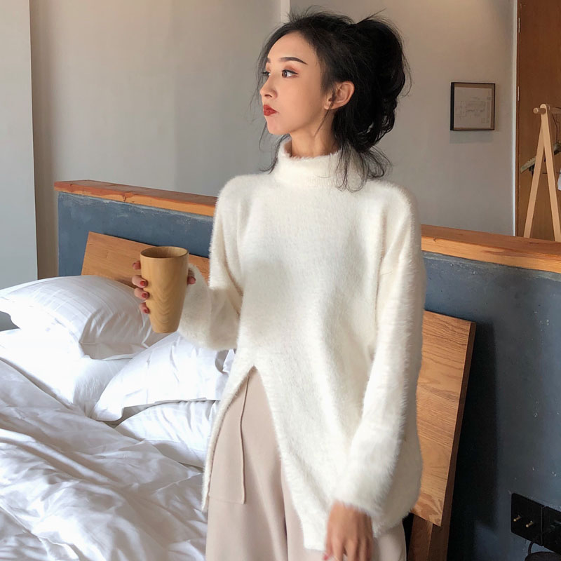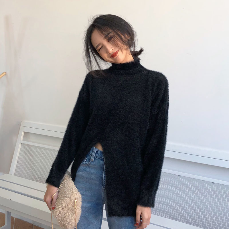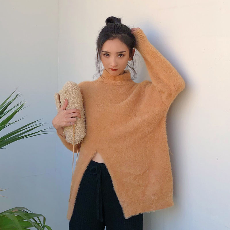 復古港味慵懶風毛衣女套頭開叉貂絨百搭半高領中長款寬松針織衫潮