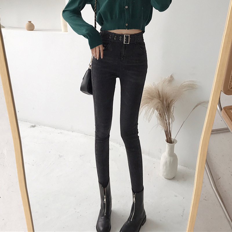 / 復古風高腰顯瘦緊身牛仔褲女秋冬裝新款學生黑色彈力九分鉛筆褲子