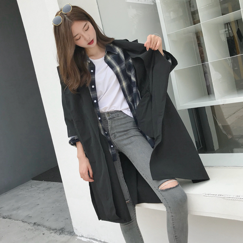 春秋新款女裝韓版寬松顯瘦系帶七分袖中長款過膝風衣外套女開衫潮