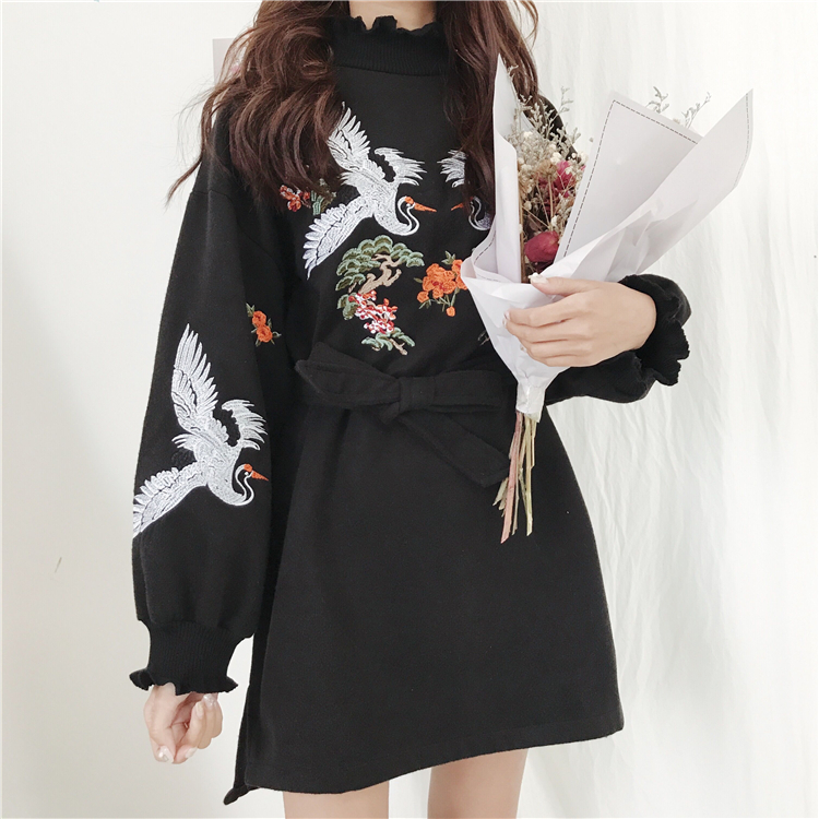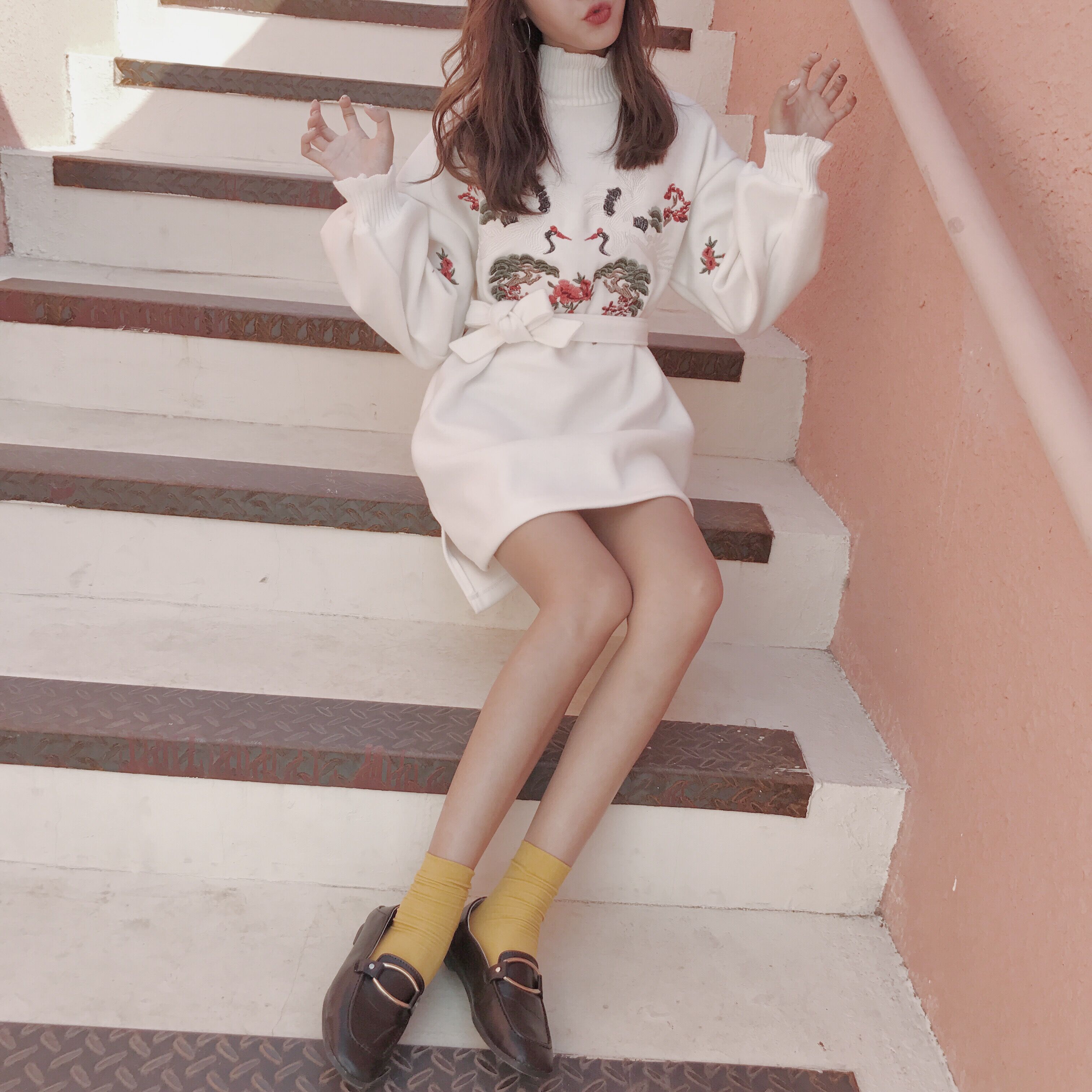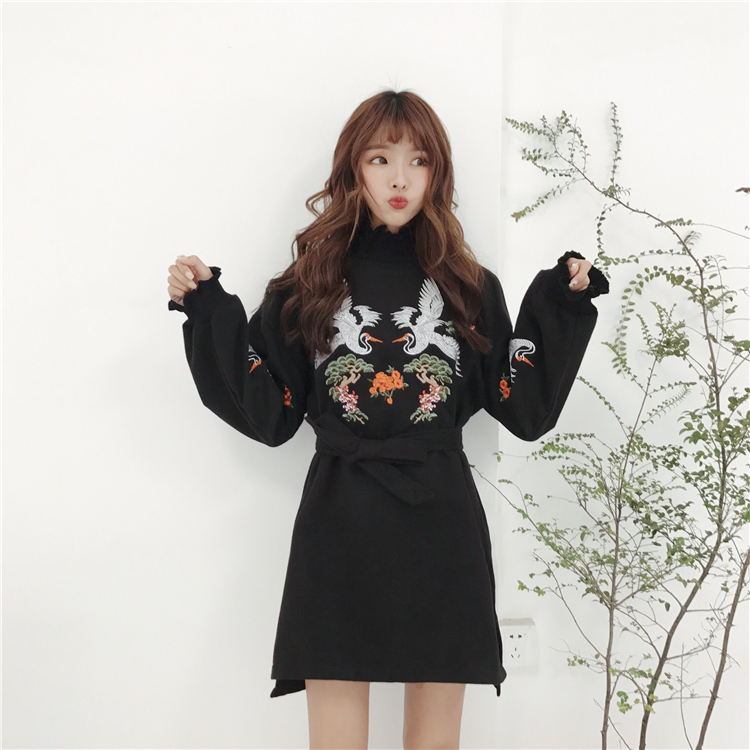/ 韓國慵懶風上衣女仙鶴刺繡寬松加厚呢子中長款套頭長袖系帶衛衣女