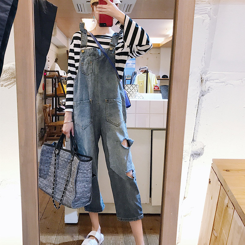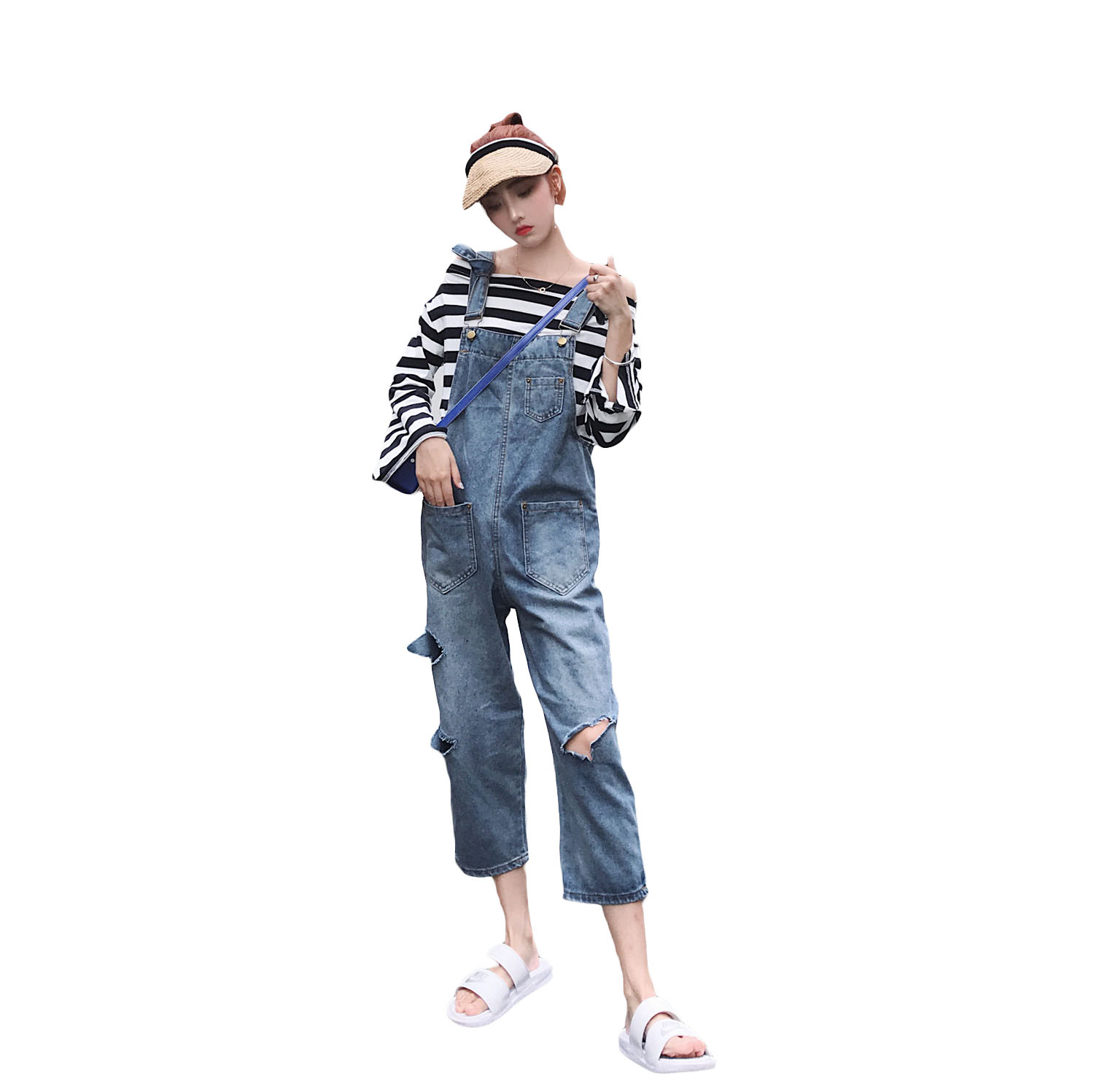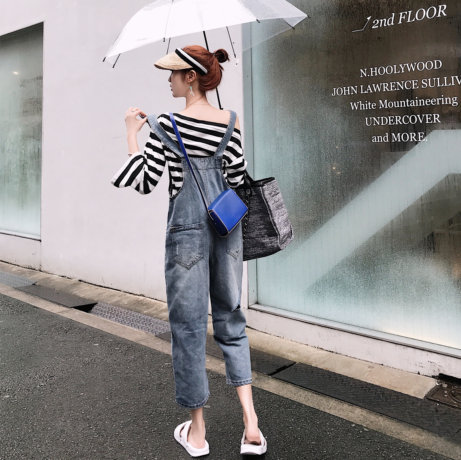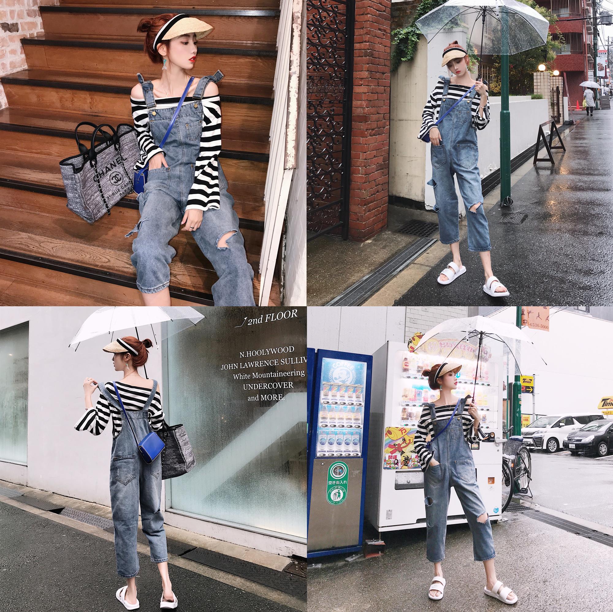 2018新款學院風同款水洗破洞牛仔背帶褲女+條紋T恤時髦套裝分開拍