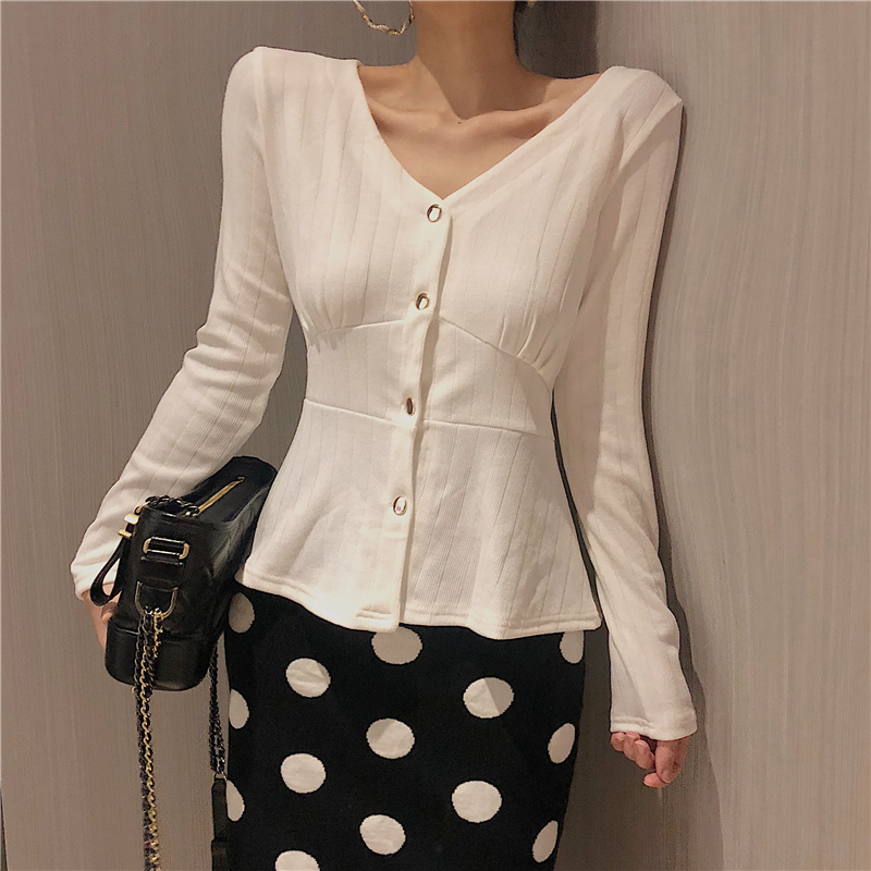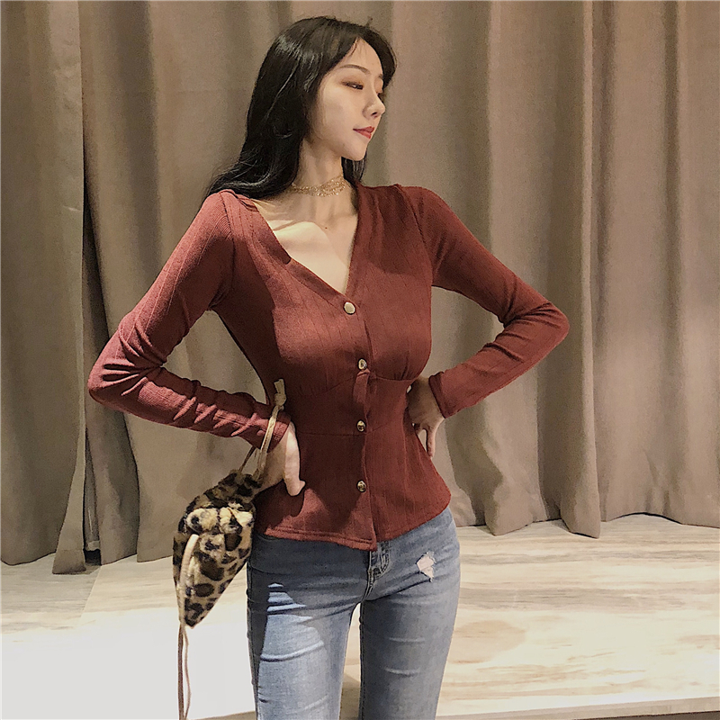 / 冬裝上衣女慵懶長袖t袖女百搭V領緊身系扣短款高腰打底針織衫開衫
