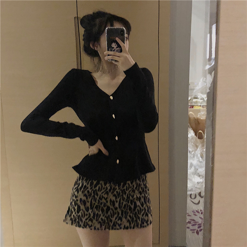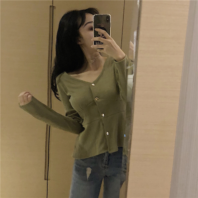 冬裝上衣女慵懶長袖t袖女百搭V領緊身系扣短款高腰打底針織衫開衫