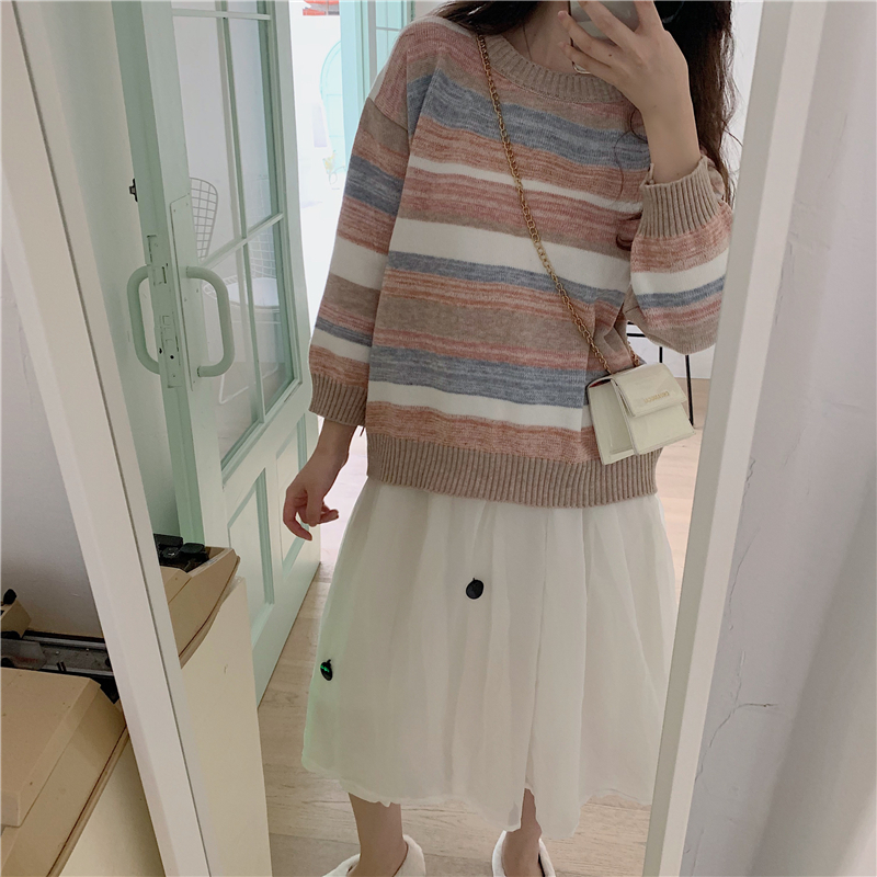 2018冬季新款休閑拼色毛衣修身九分袖上衣+高腰網紗半身裙女套裝