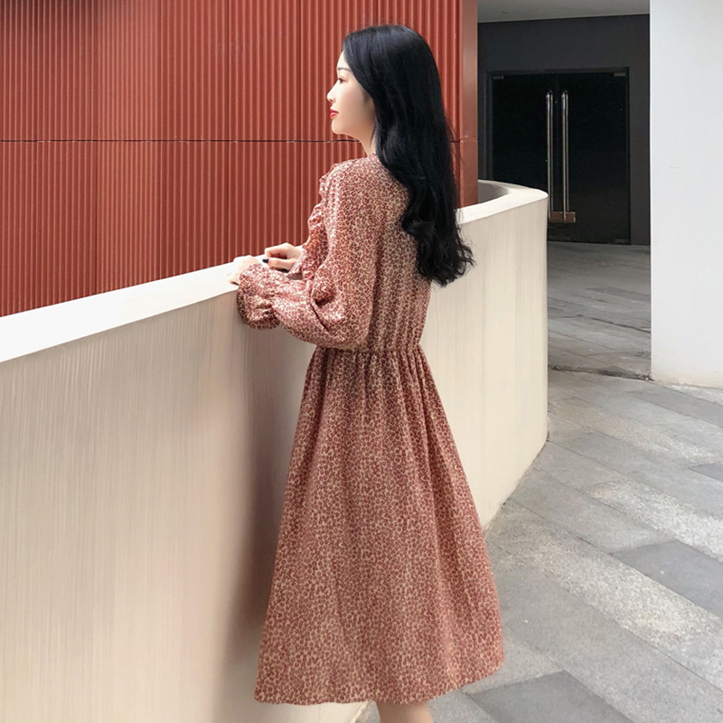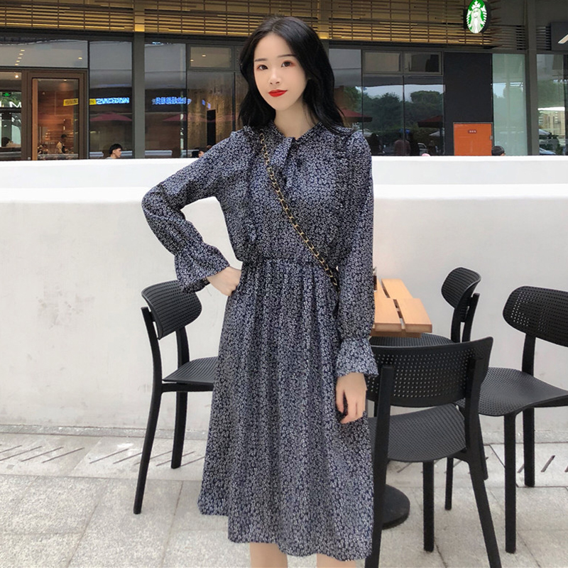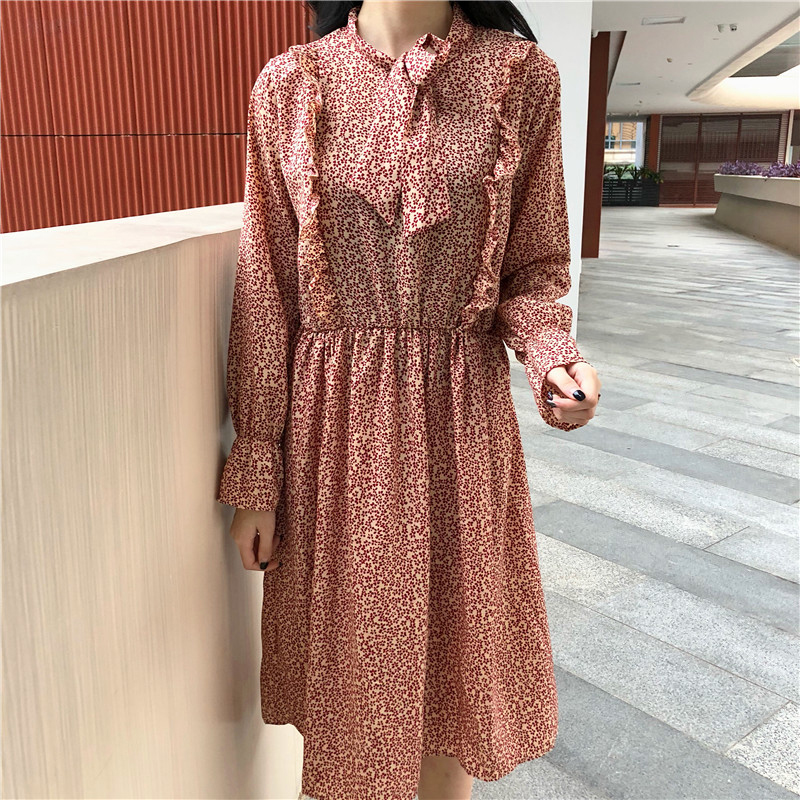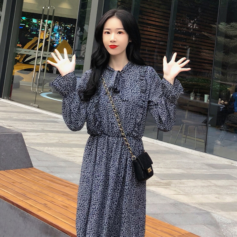 / 秋冬裝2018新款韓風chic碎花雪紡長袖連衣裙法式少女復古A字裙子