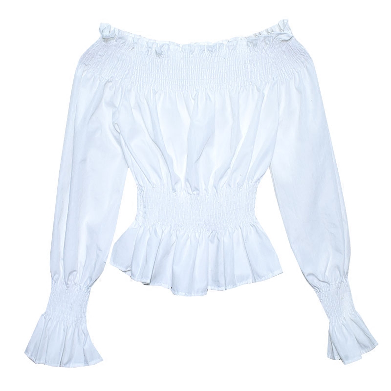 / 秋季新款復古韓國落肩花邊一字肩長袖上衣顯瘦褶皺套頭氣質襯衫女