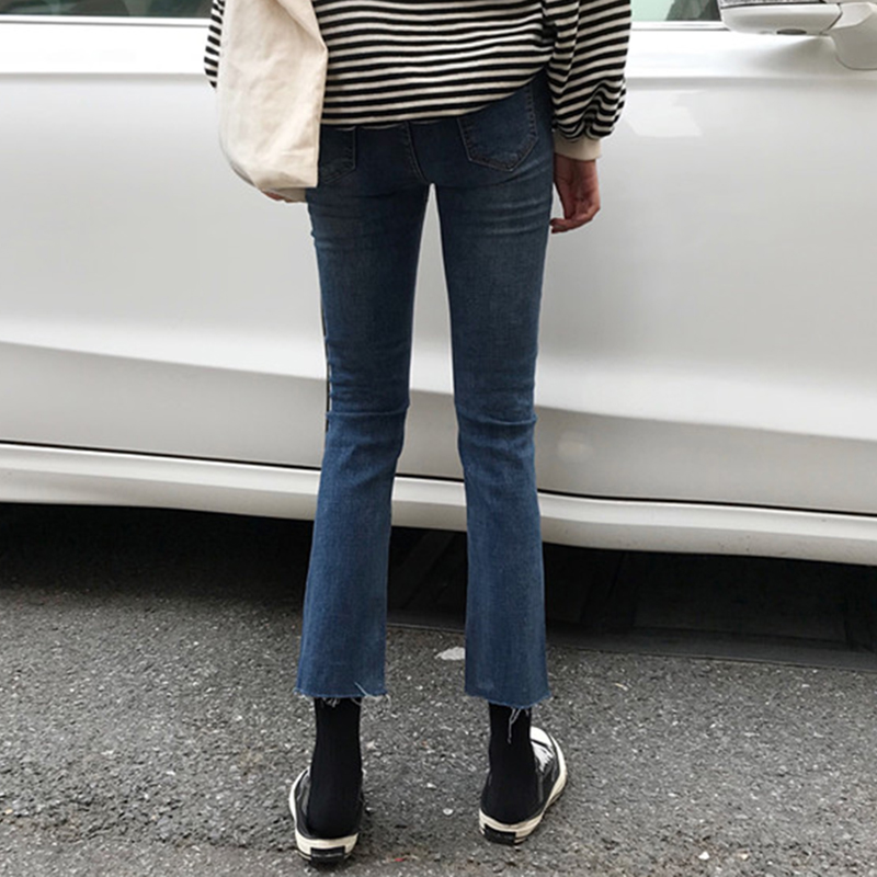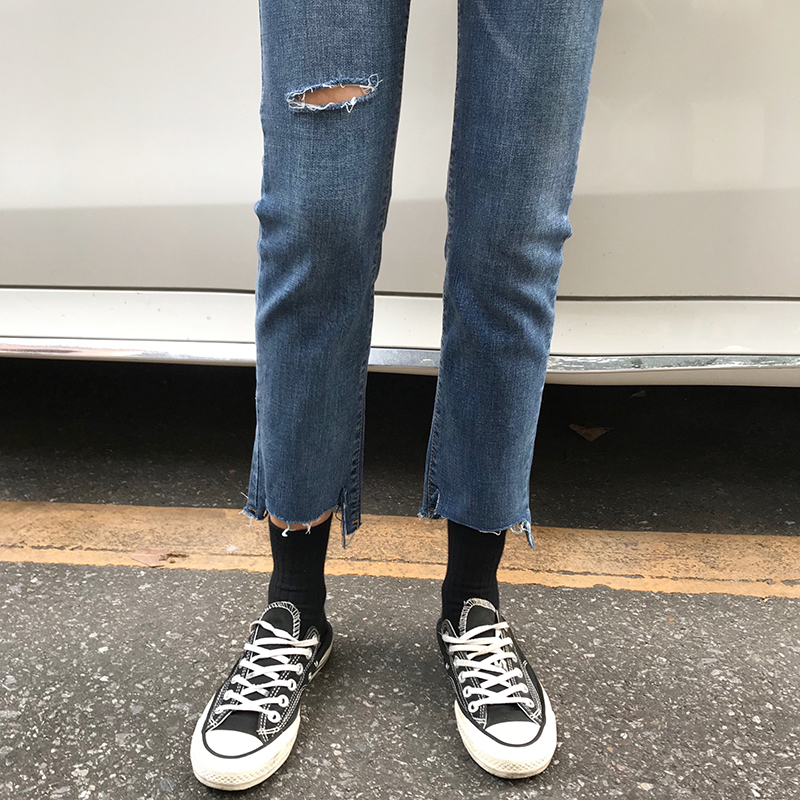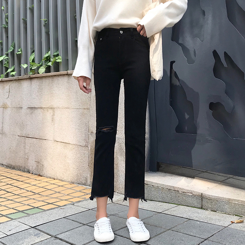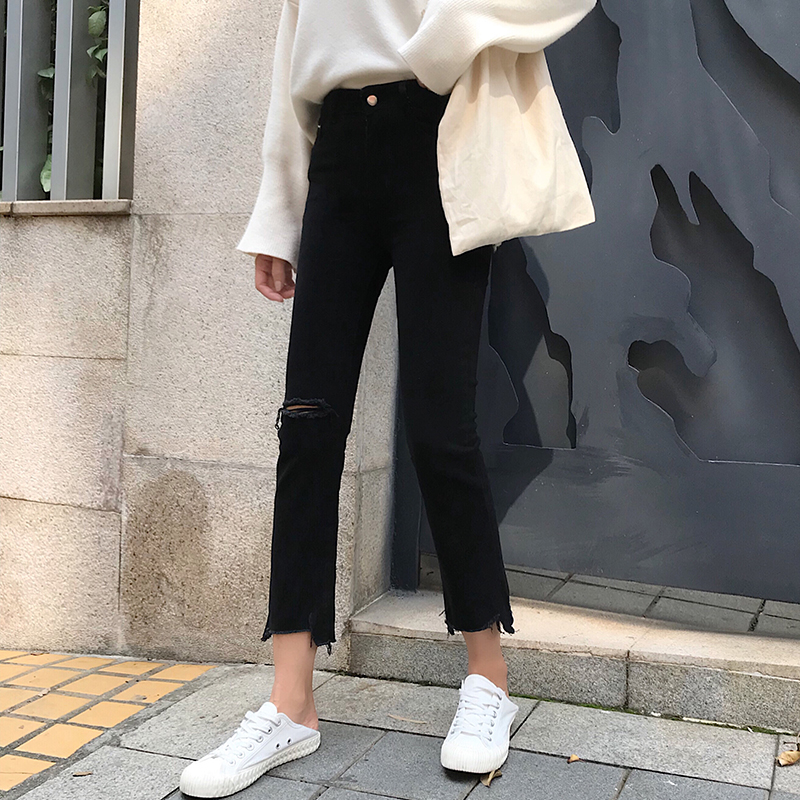 復古風彈力破洞直筒牛仔褲女秋冬裝新款學生高腰顯瘦九分休閑褲子