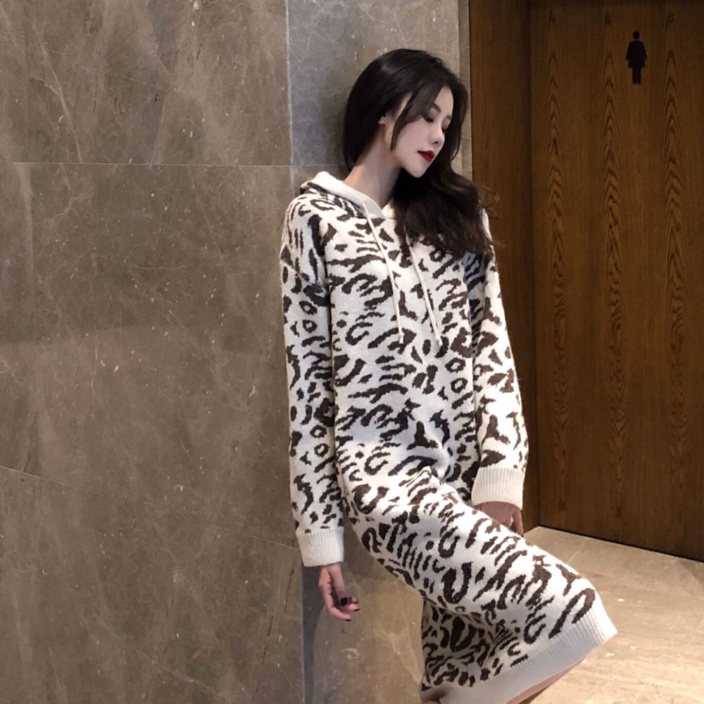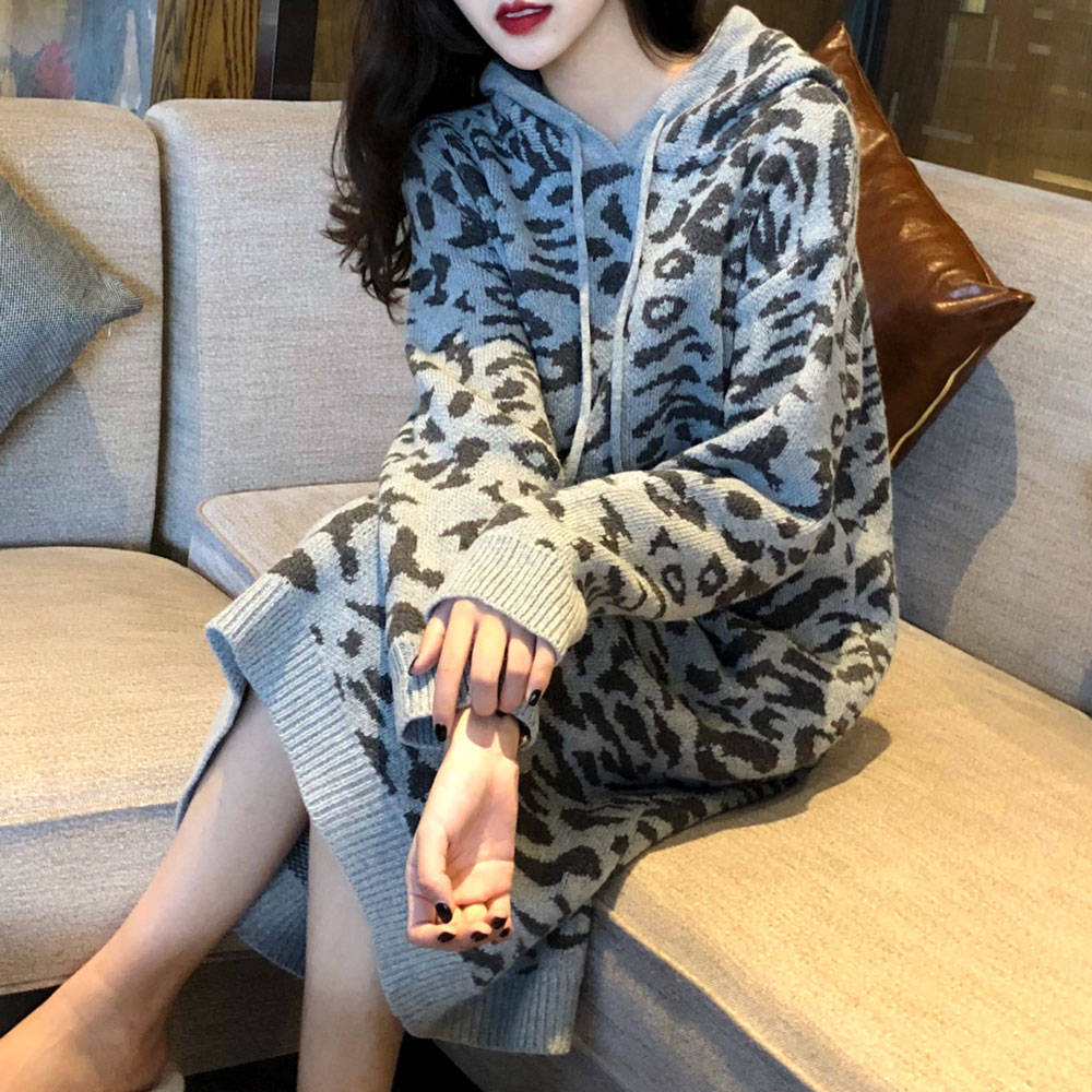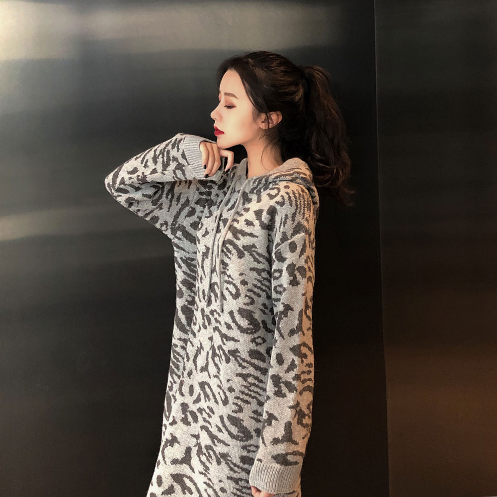 / 港味時尚復古寬松豹紋連帽針織連衣裙女秋冬2018新款中長款毛衣裙