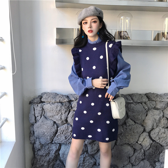 / 女神套裝秋冬新款長袖修身襯衫+木耳邊波點加厚針織背心裙兩件套