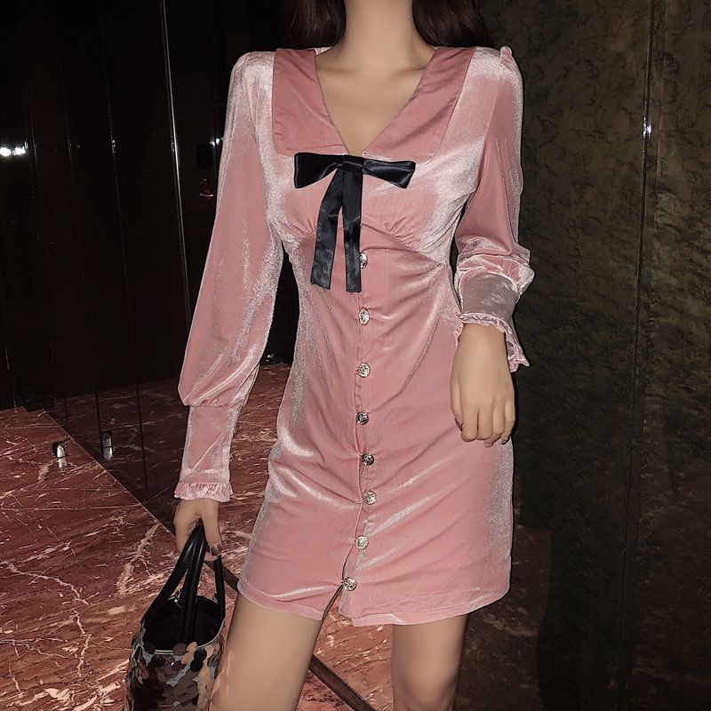 / 女神范女秋裝2018新款裙子單排扣蝴蝶結收腰顯瘦長袖絲絨連衣裙潮