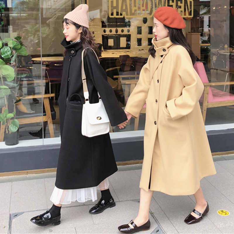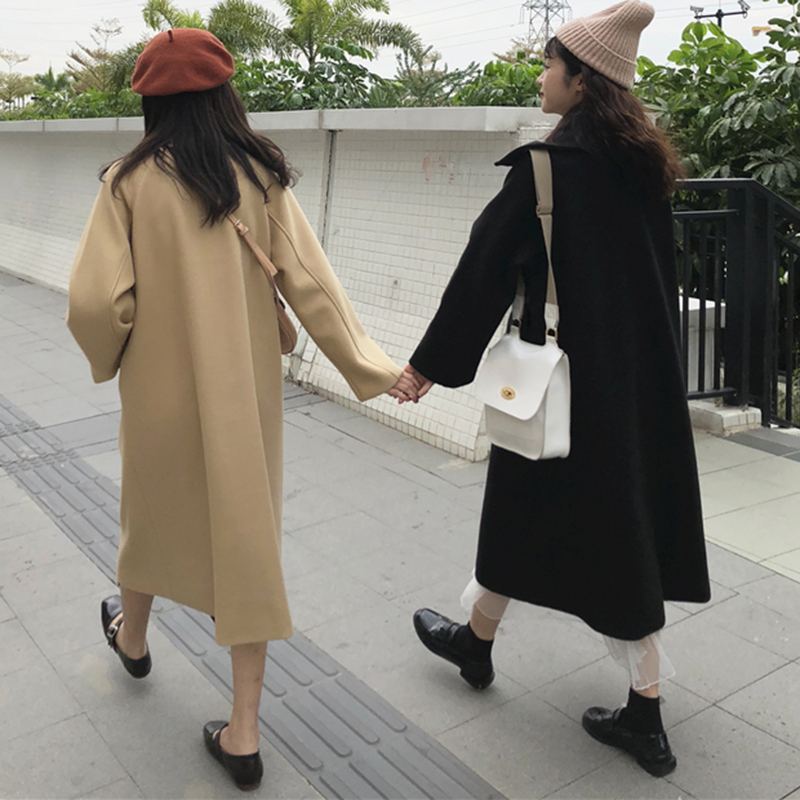 2018流行長袖毛呢外套女秋冬裝新款赫本大衣加厚長款黑色開衫上衣