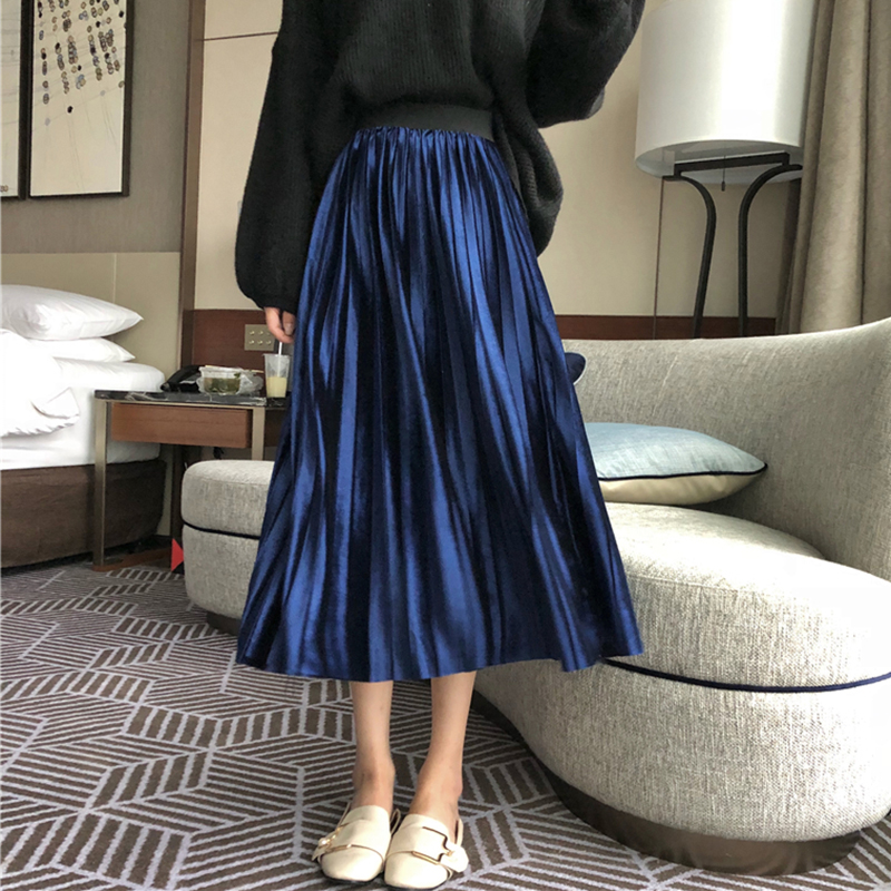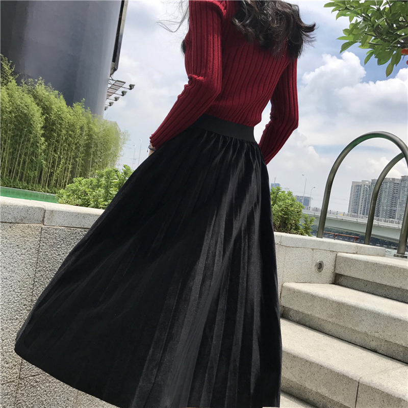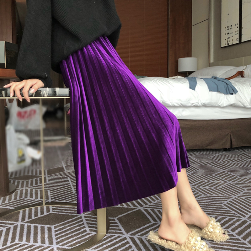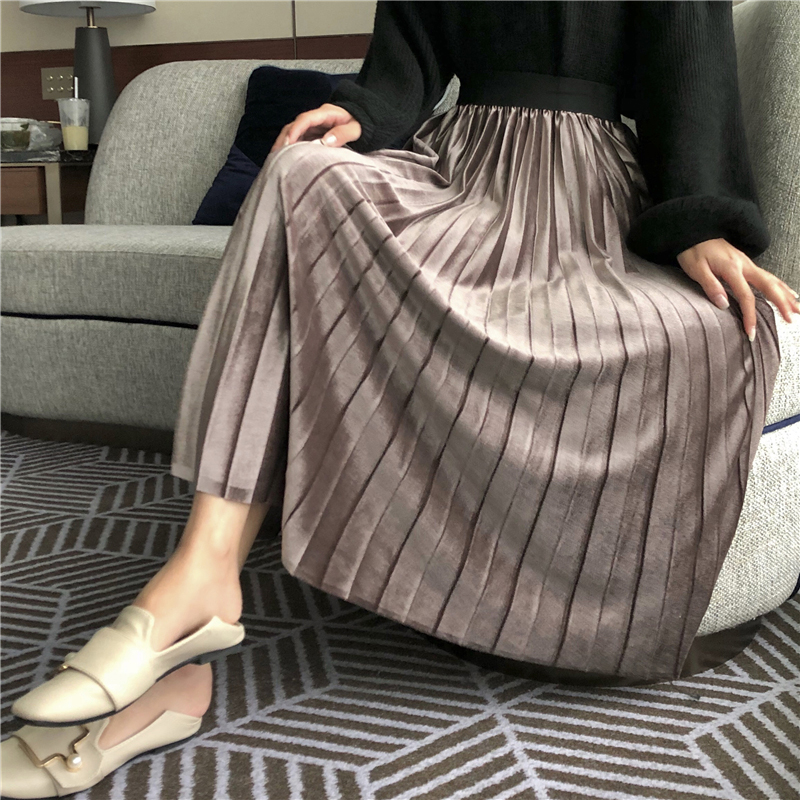 / 洋氣絲絨百褶半身裙女秋裝新款復古高腰A字裙時尚氣質中長黑裙子