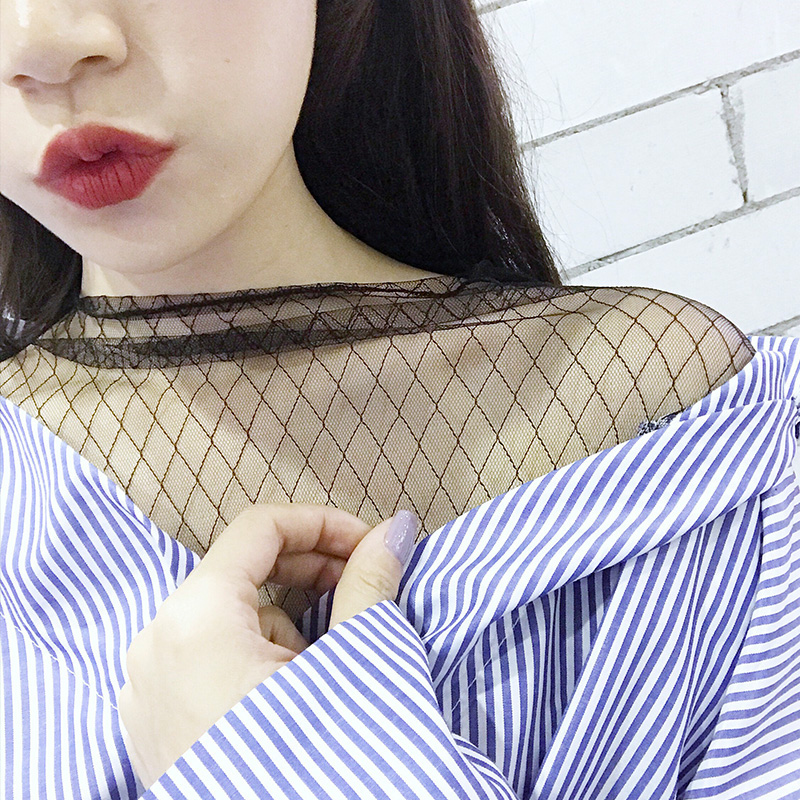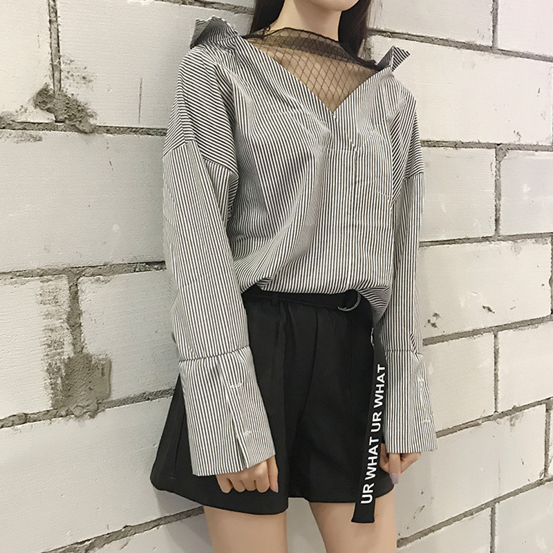 / 學生休閑襯衫早秋2018新款女裝港味條紋拼接網紗假兩件寬松上衣潮