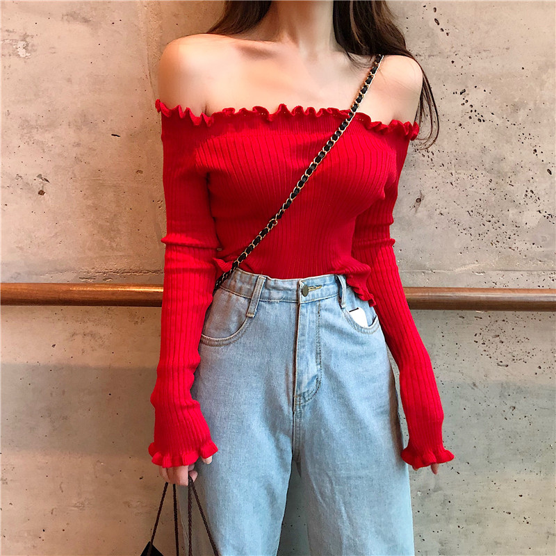 韓風秋裝女2018新款一字露肩木耳邊長袖針織衫修身短款打底上衣潮