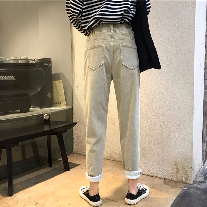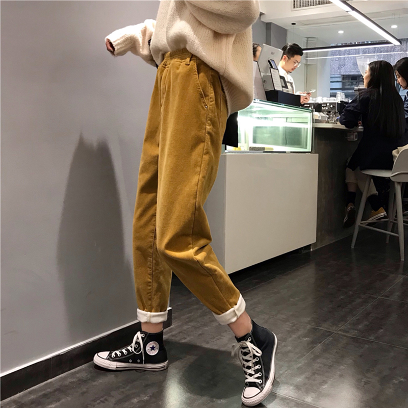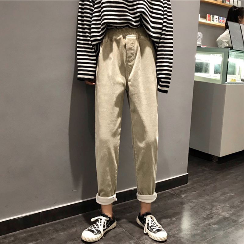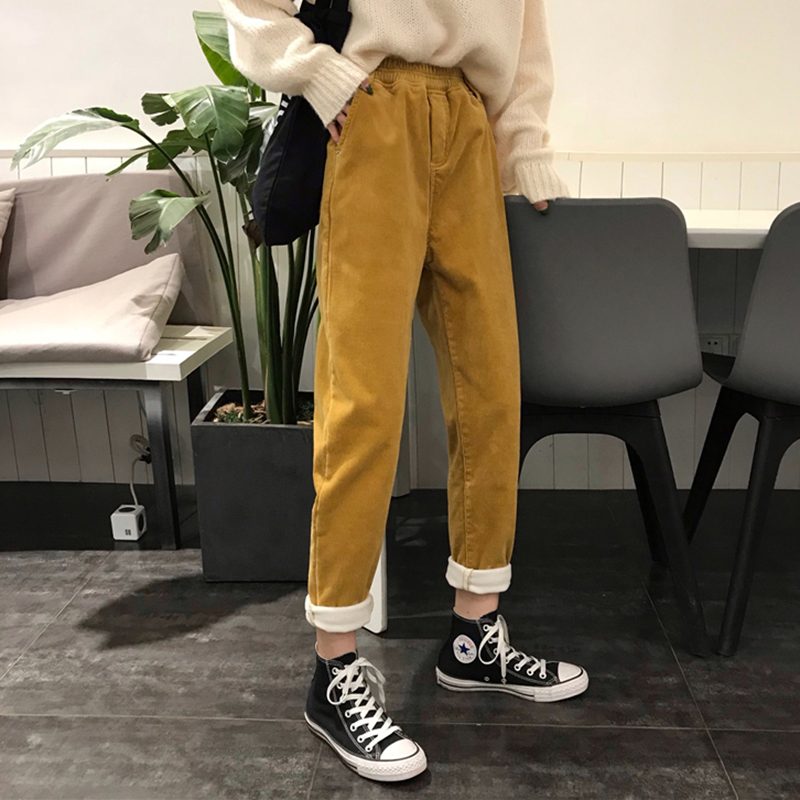 / 高腰顯瘦加絨休閑褲子女秋冬裝新款學生復古風燈芯絨寬松哈倫長褲