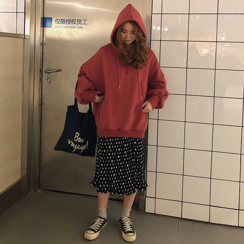 網紅兩件套女秋冬裝新款寬松加絨連帽衛衣時尚波點松緊高腰百褶裙