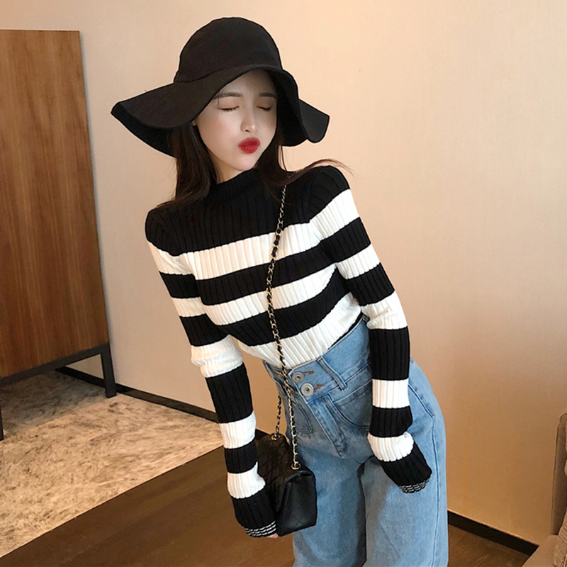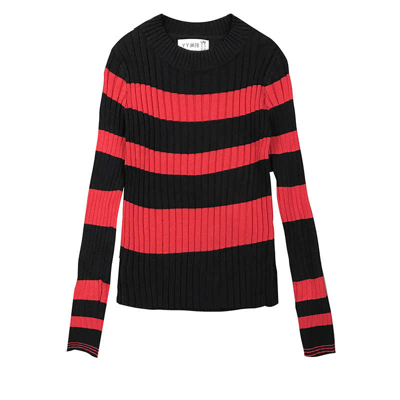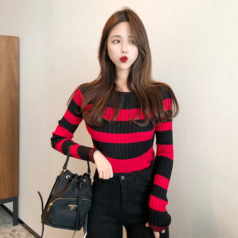 條紋針織衫女2018新款復古港風修身長袖打底衫洋氣圓領短上衣秋裝