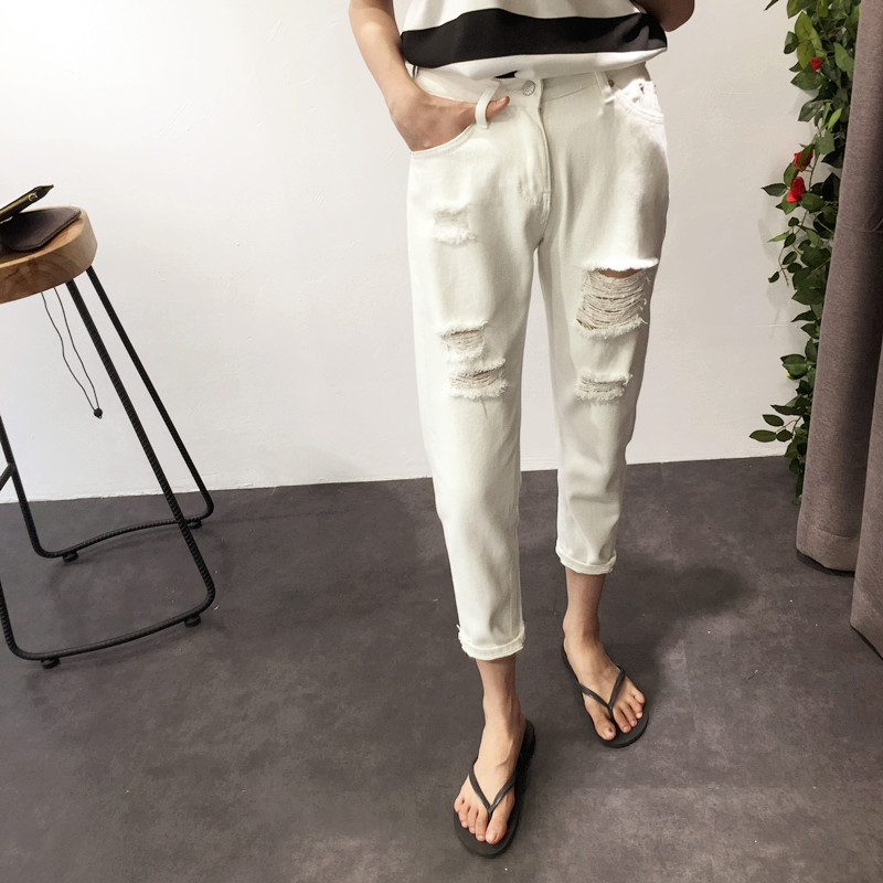 春季女裝韓版寬松流蘇破洞白色低腰牛仔褲女學生顯瘦小腳哈倫褲潮