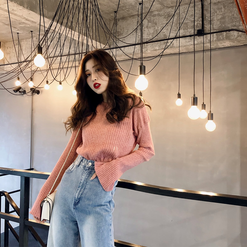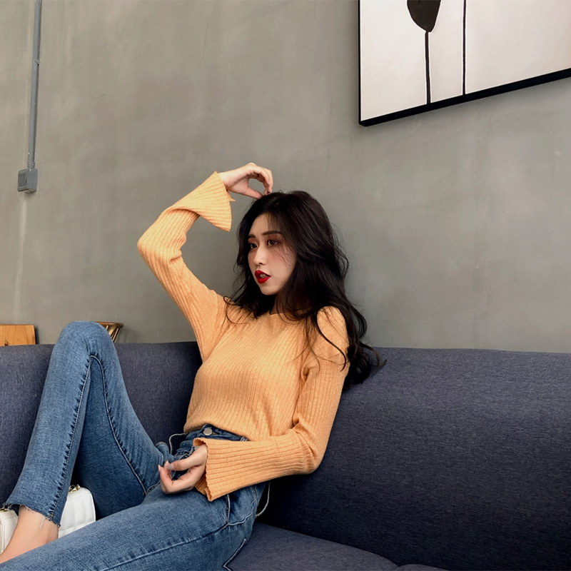 復古時尚純色百搭修身坑條長袖打底針織衫女學生韓版chic早秋上衣