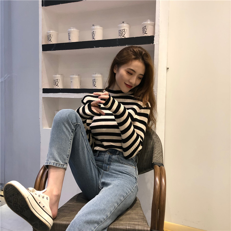/ 慵懶風套頭毛衣女2018新款秋冬修身顯瘦高領條紋加厚打底針織衫女