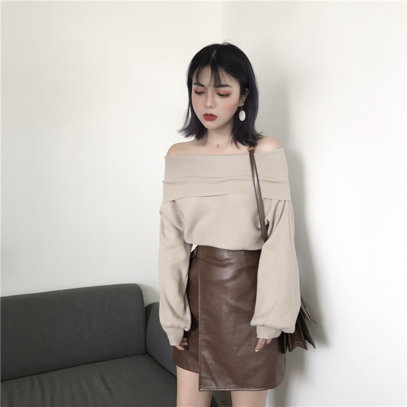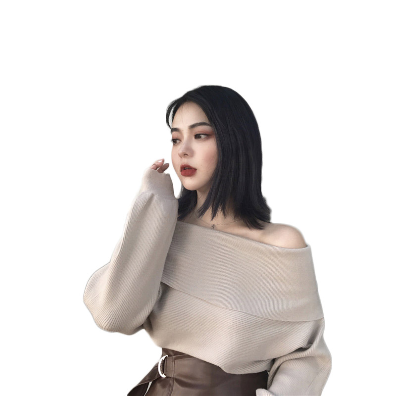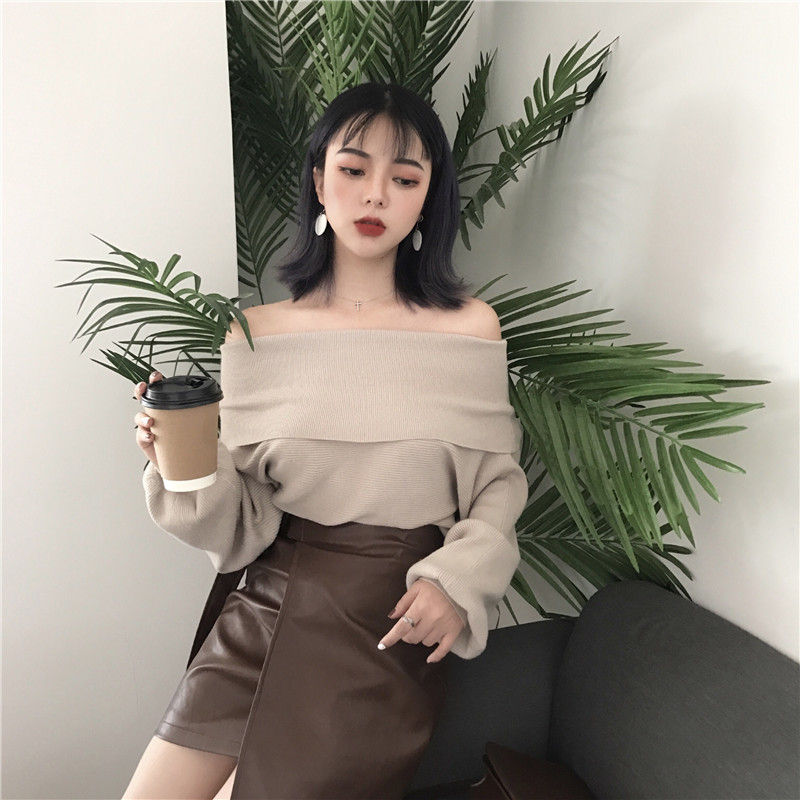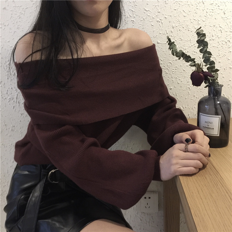 時尚簡約風氣質百搭純色一字領露肩款顯瘦長袖毛衣針織衫女長袖秋