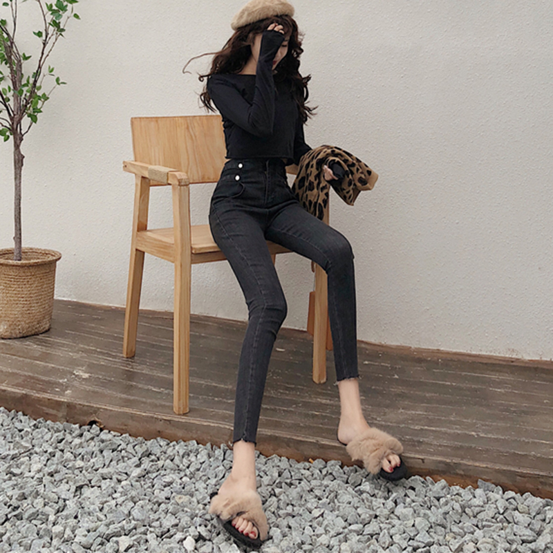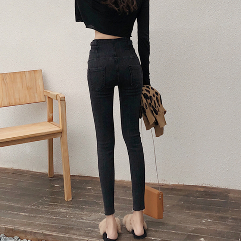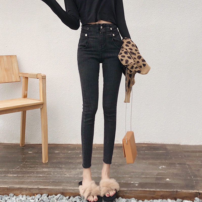 / 韓版高腰顯瘦緊身牛仔褲女秋冬裝新款學生復古風彈力小腳鉛筆褲子