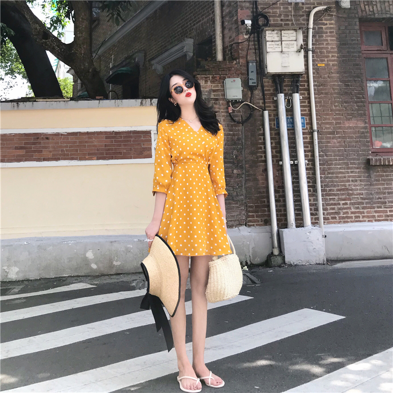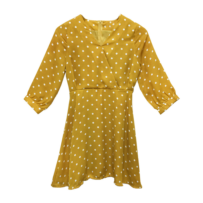 夏季2018新款氣質百搭韓版短裙V領高腰A字波點圓點雪紡連衣裙女潮