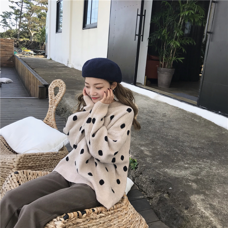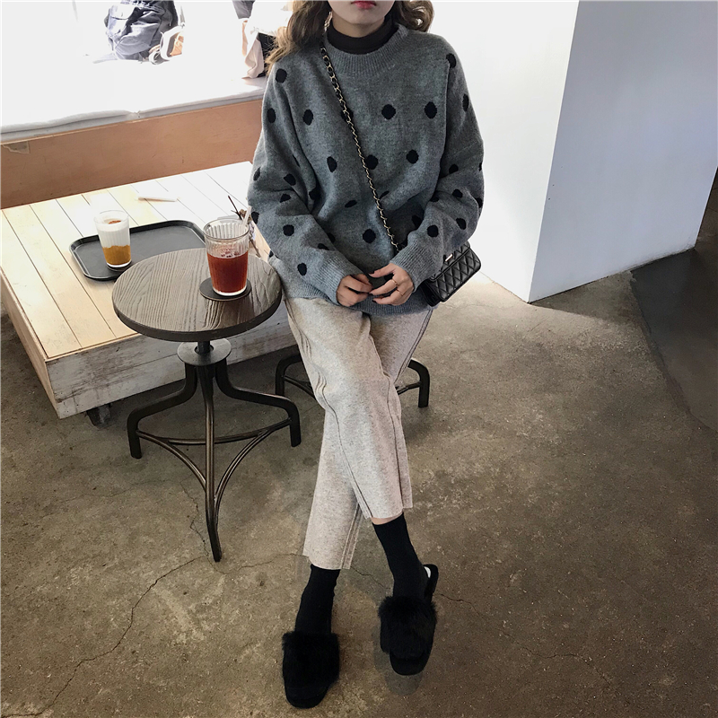 網紅同款2018新款秋冬寬松慵懶風套頭毛衣女波點圓領針織衫外套女