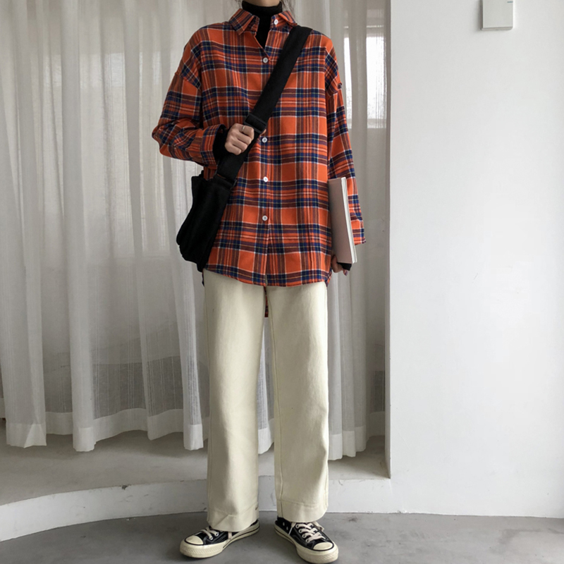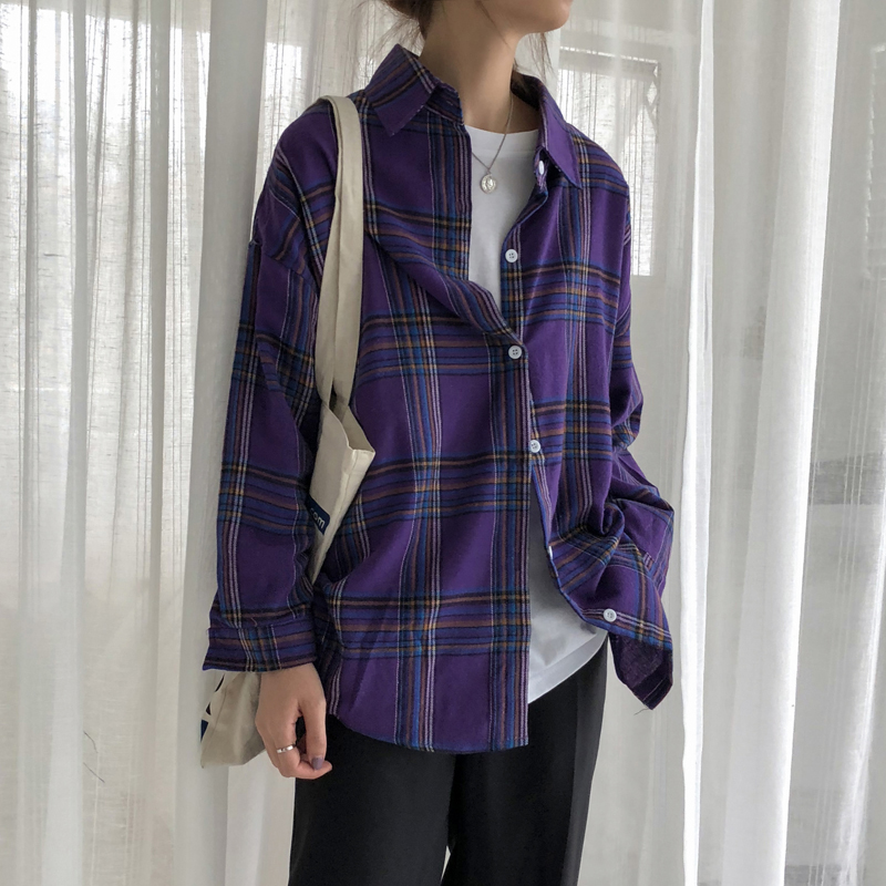 / 復古格子寬松長袖上衣秋裝女2018新款小清新學生慵懶休閑襯衫外套