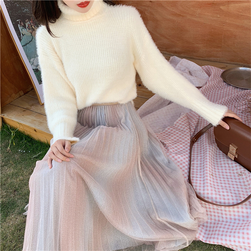 / 毛衣配裙子兩件套女裝秋冬新款寬松高領套頭針織衫高腰A字百褶裙