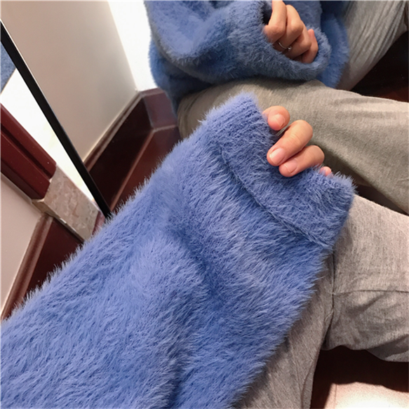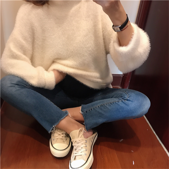 復古港味慵懶風毛衣女套頭開叉貂絨百搭半高領中長款寬松針織衫潮