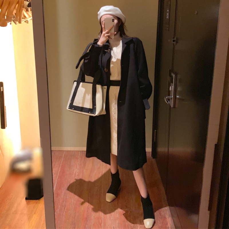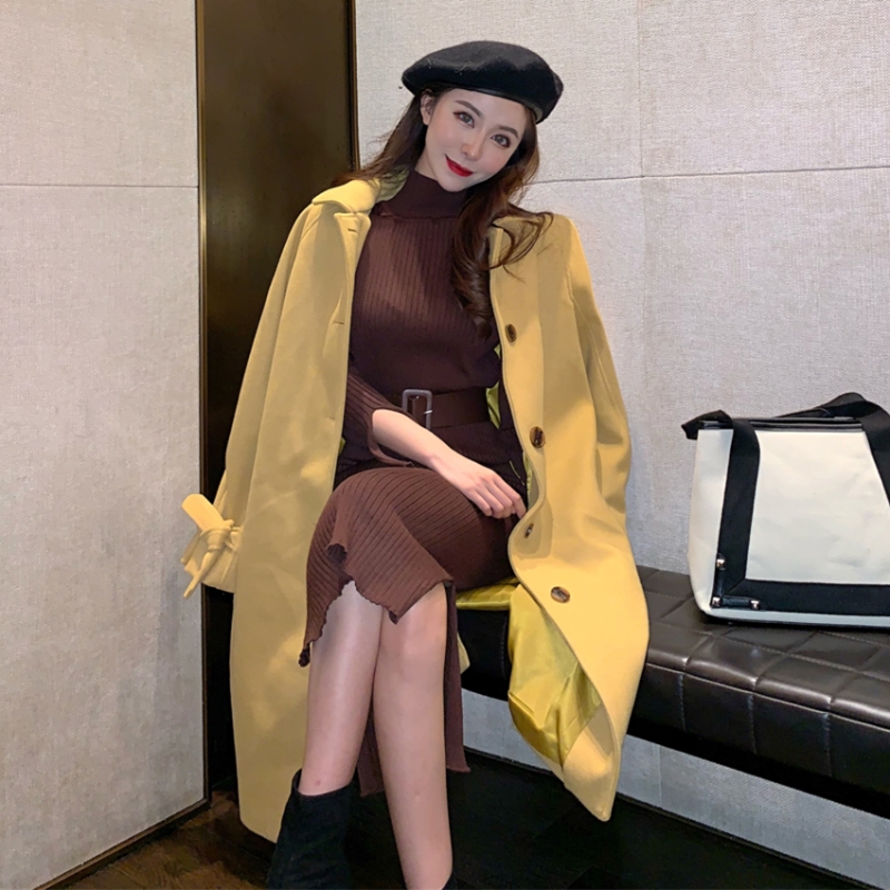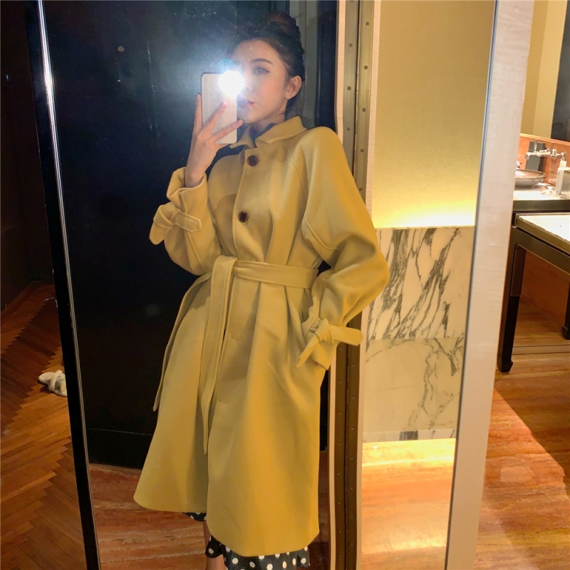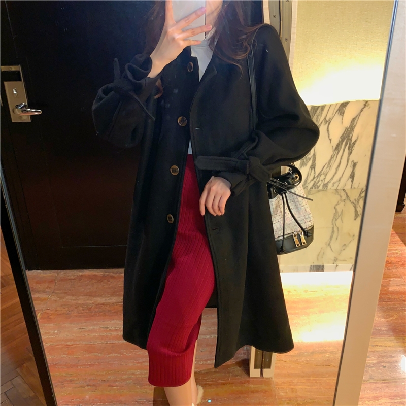 / 韓版單排扣呢子大衣女小個子秋冬裝新款中長款系帶過膝毛呢外套女