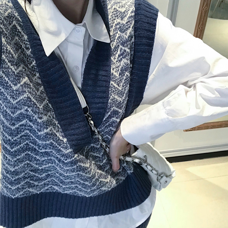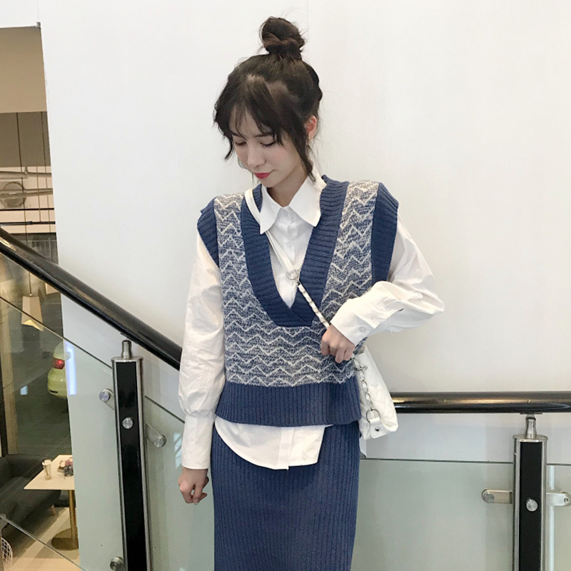 / 小香風套裝女秋2018新款寬松長袖白襯衫撞色馬甲高腰半身中長裙子