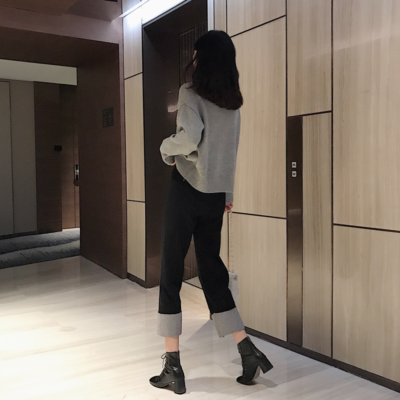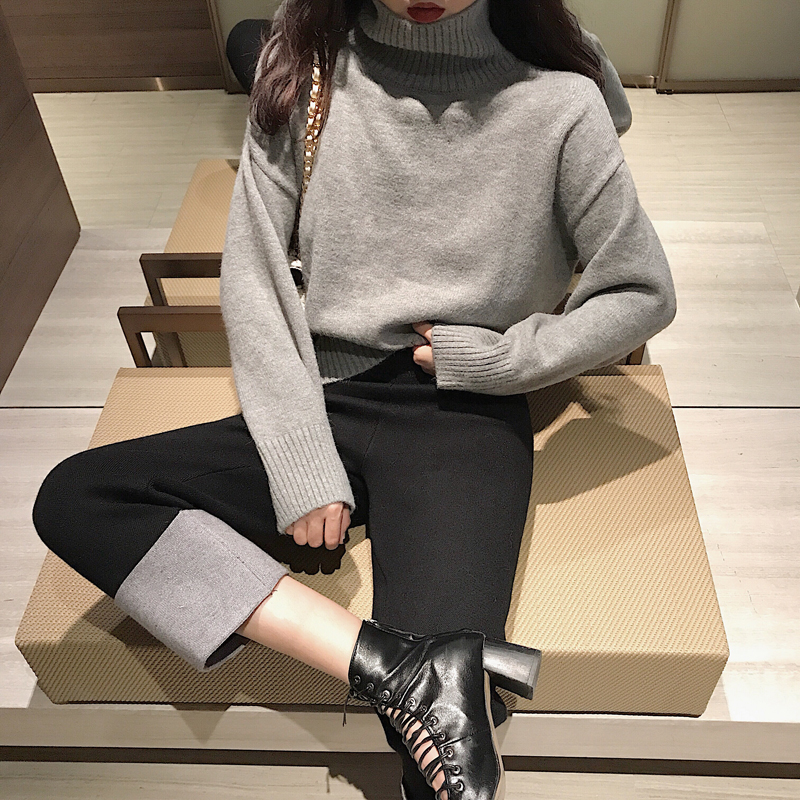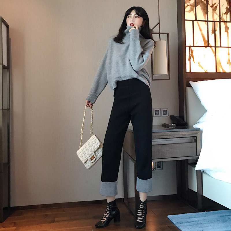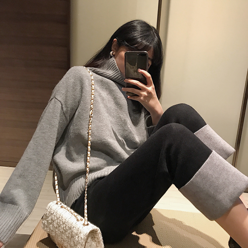 港味復古百搭高領毛衣女秋冬2018新款潮+翻邊呢子休閑褲時尚套裝