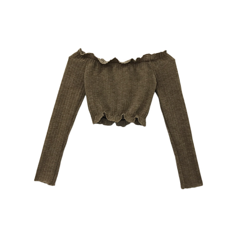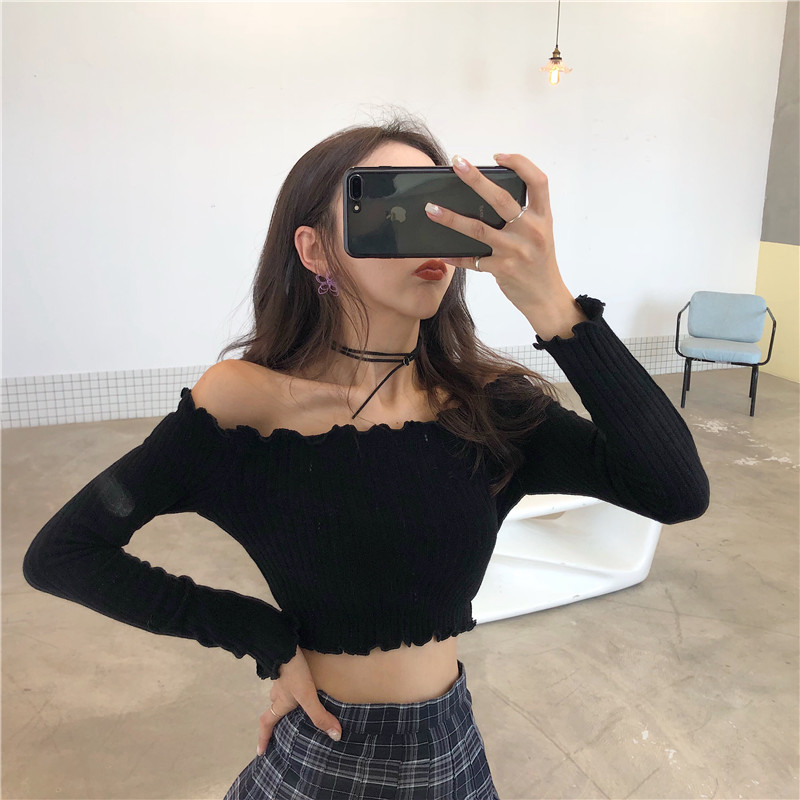 百搭漏鎖骨上衣秋裝女2018新款小心機一字肩性感露肩港味長袖T恤